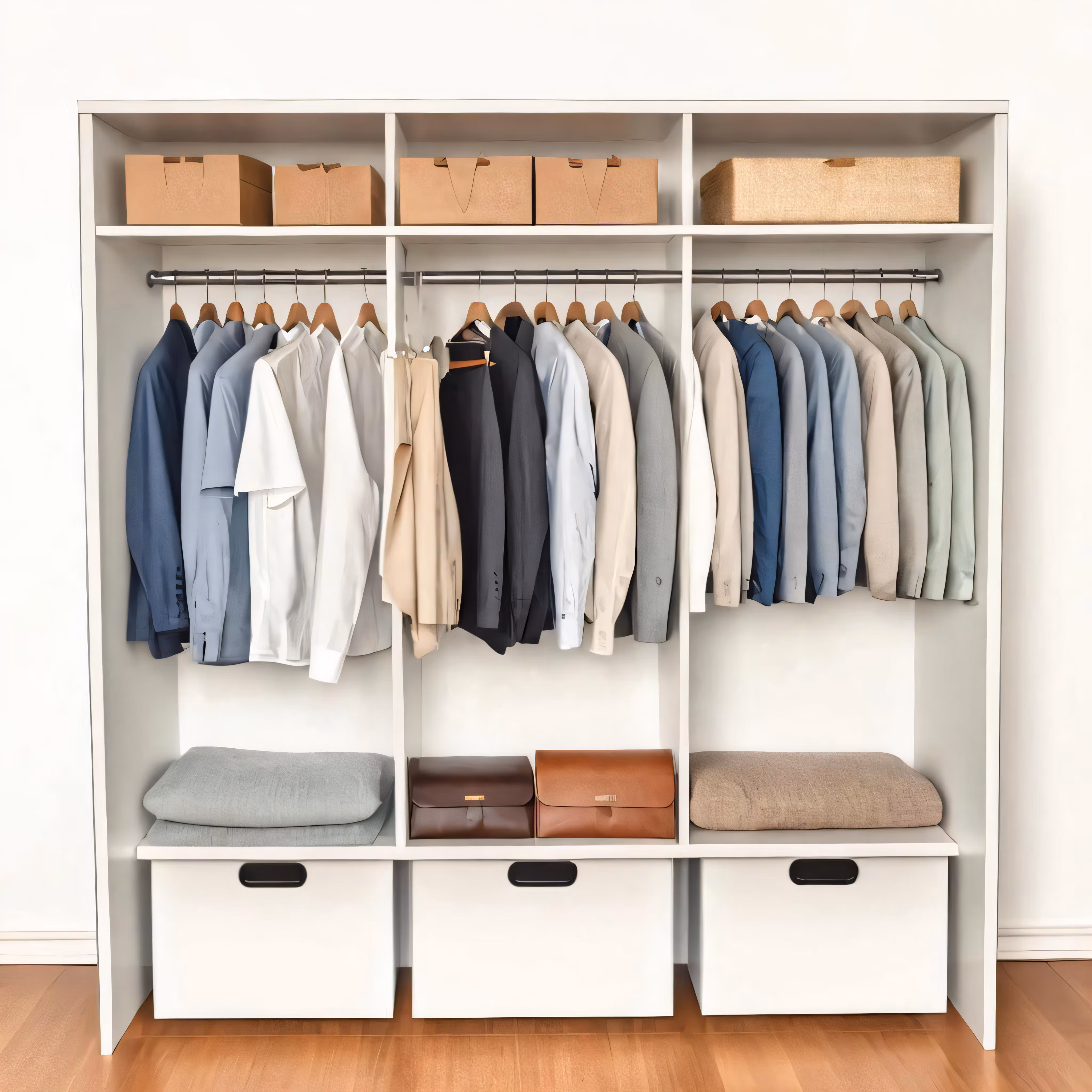 High resolution picture, free to use, a white closet has lots of clothes and boxes