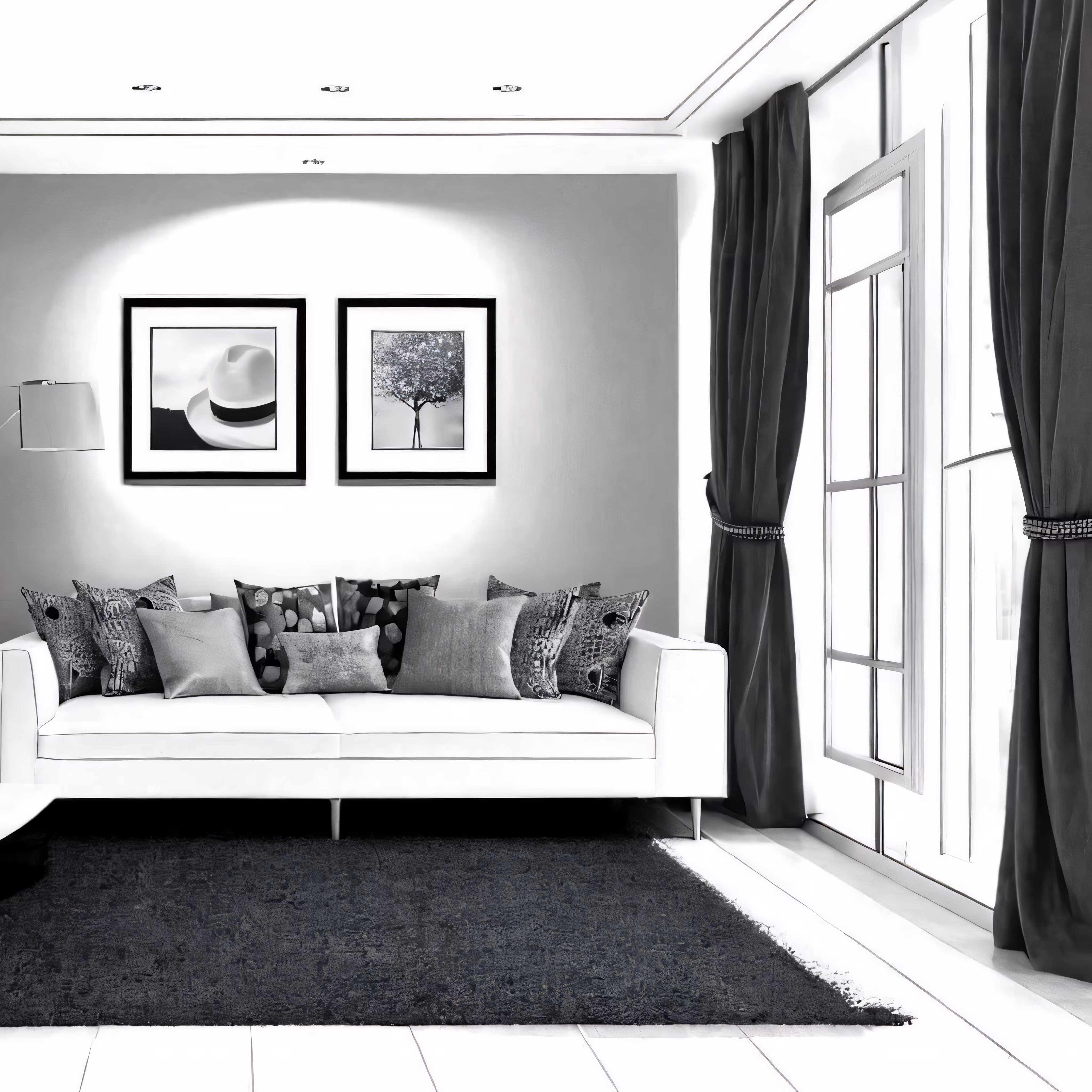 High resolution picture, free to use, a white couch with pillows sitting under two black paintings