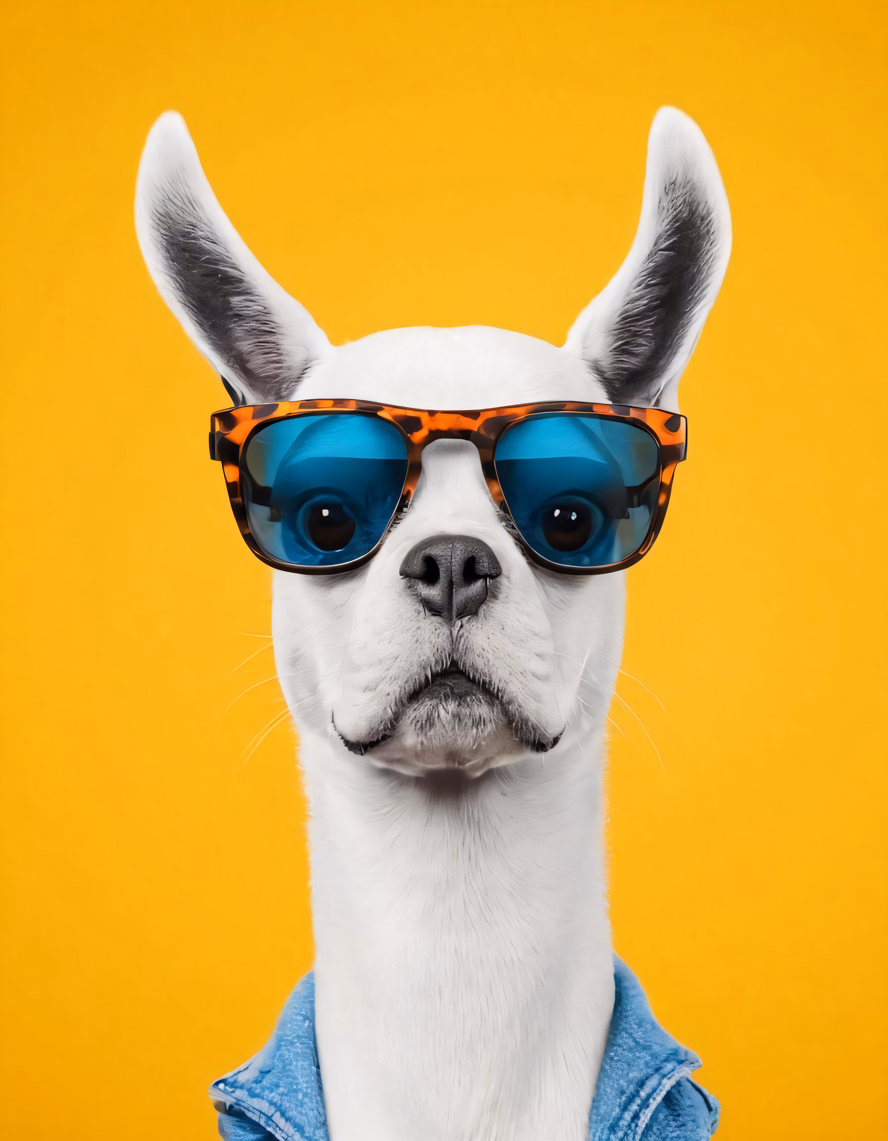 High resolution picture, free to use, a white dog with sunglasses on his face is posed