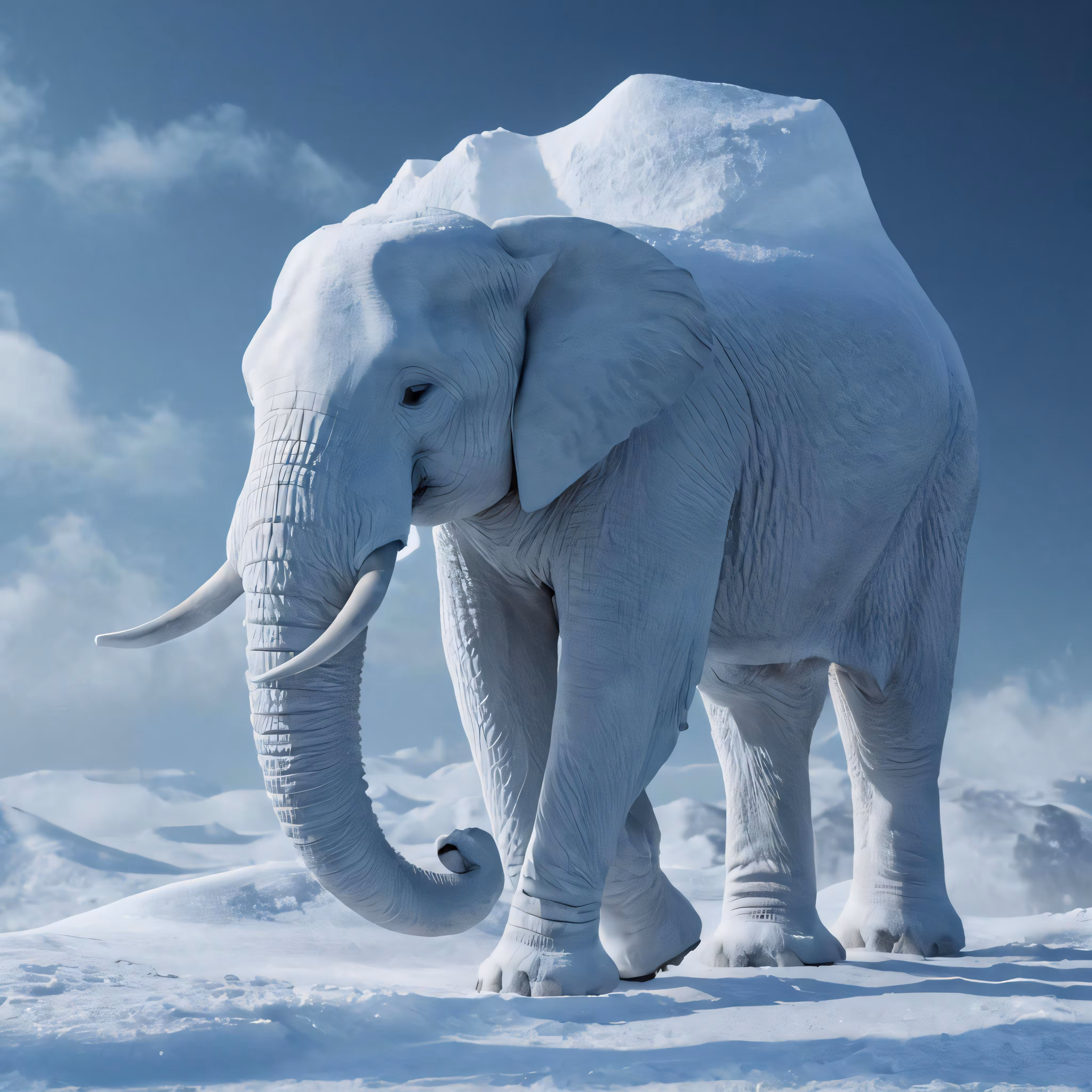 High resolution picture, free to use, a white elephant walking across a snowy field