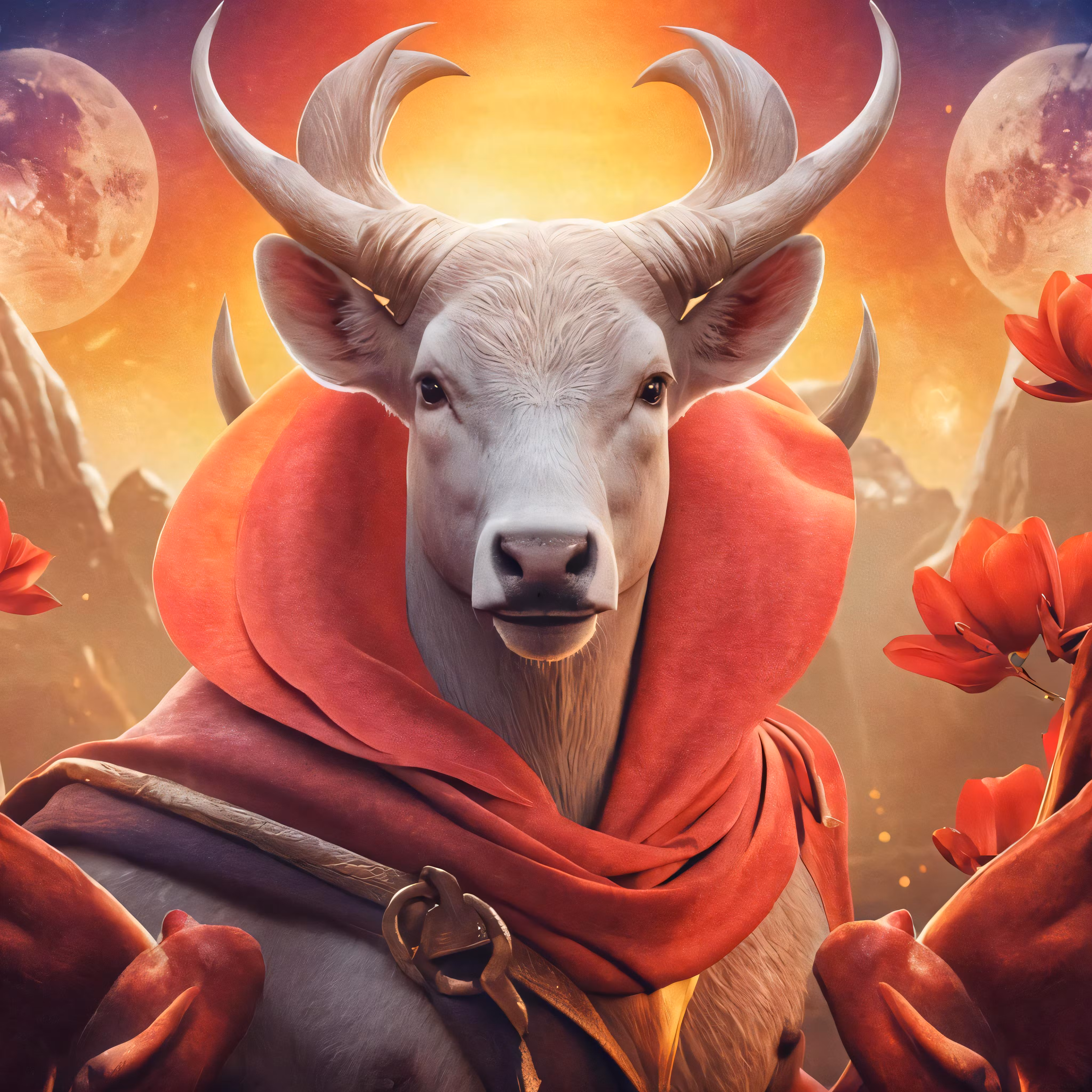 High resolution picture, free to use, a white goat wearing a red outfit and looking at the camera
