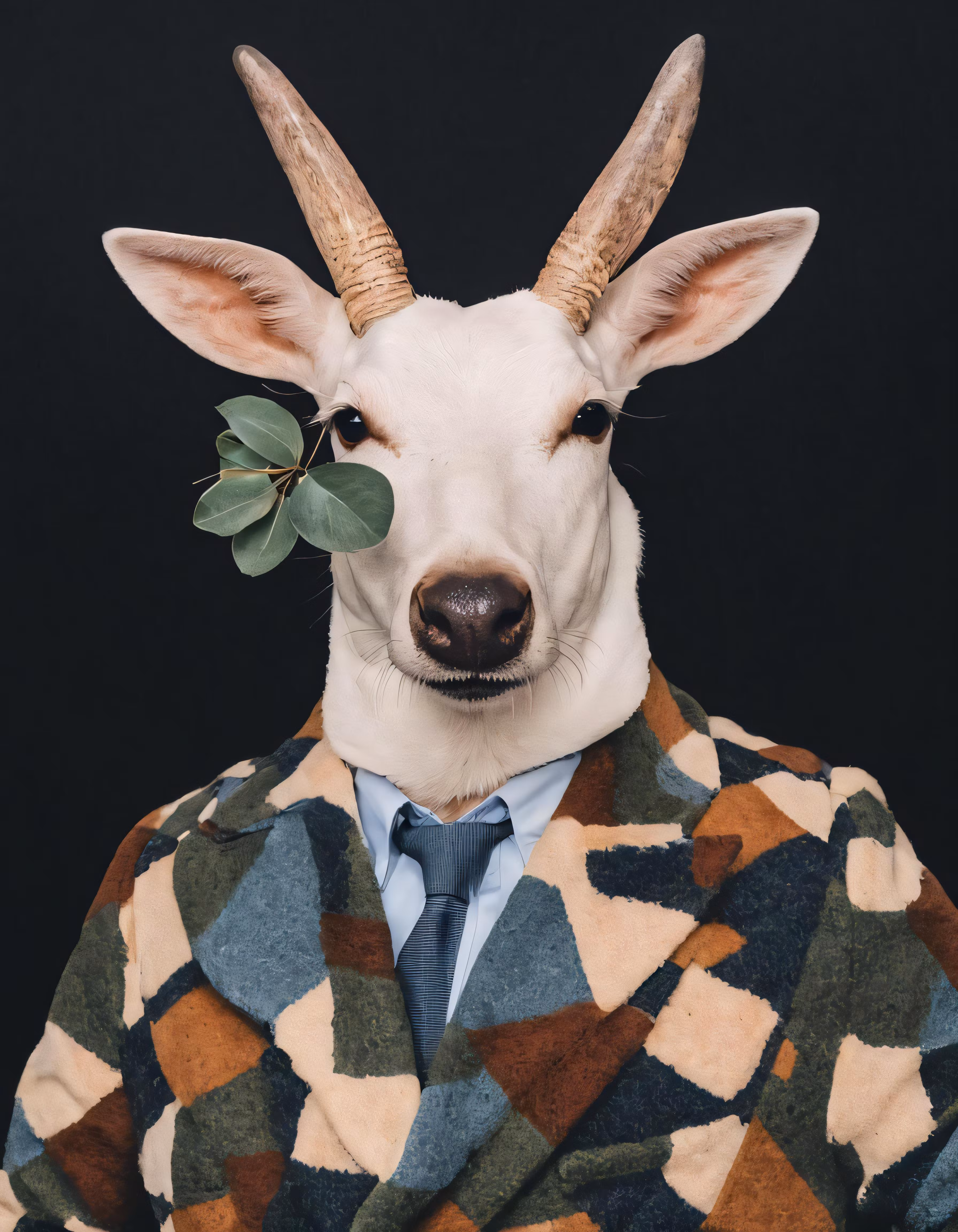 High resolution picture, free to use, a white goat wearing an odd looking suit