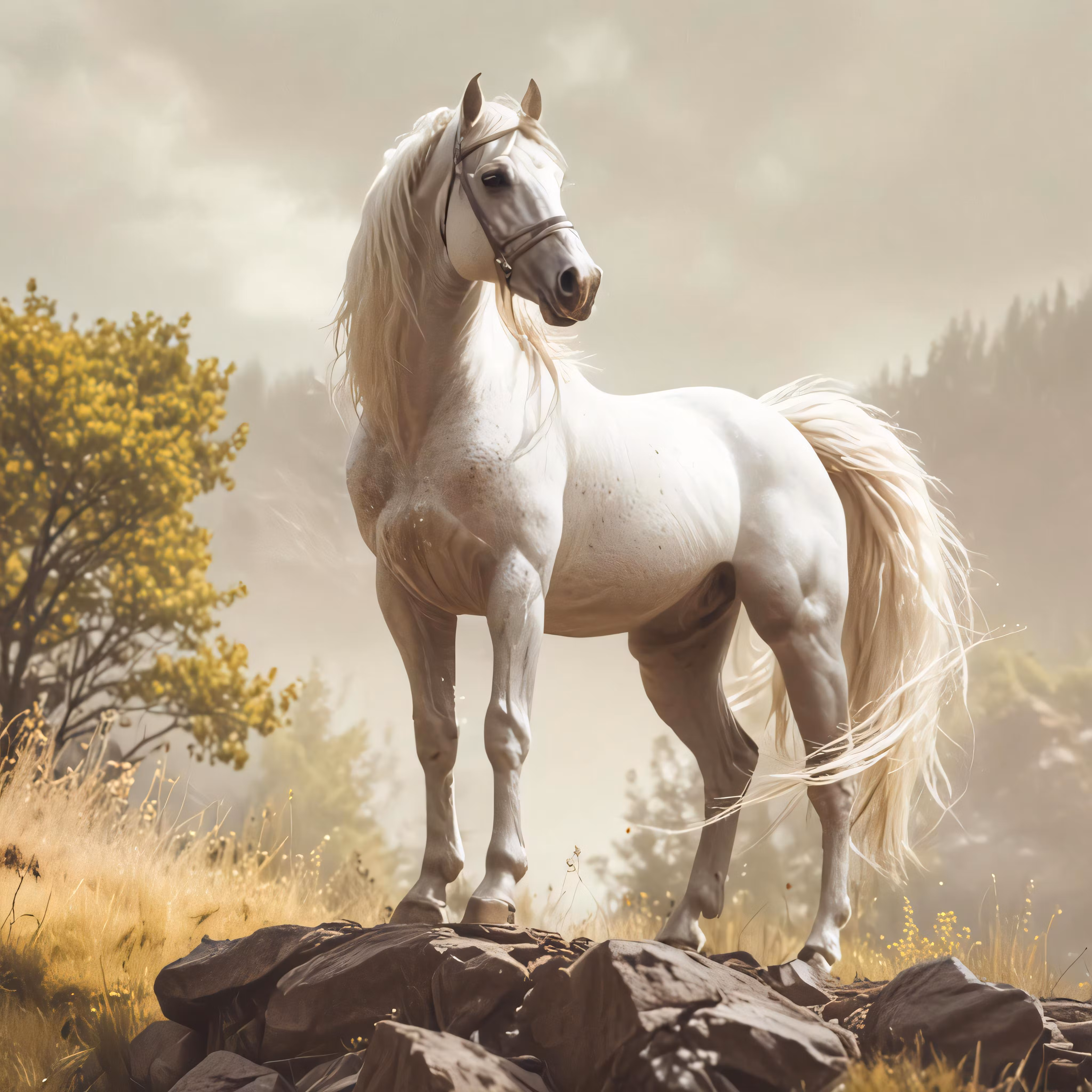 High resolution picture, free to use, a white horse is standing on rocks on top of some grass