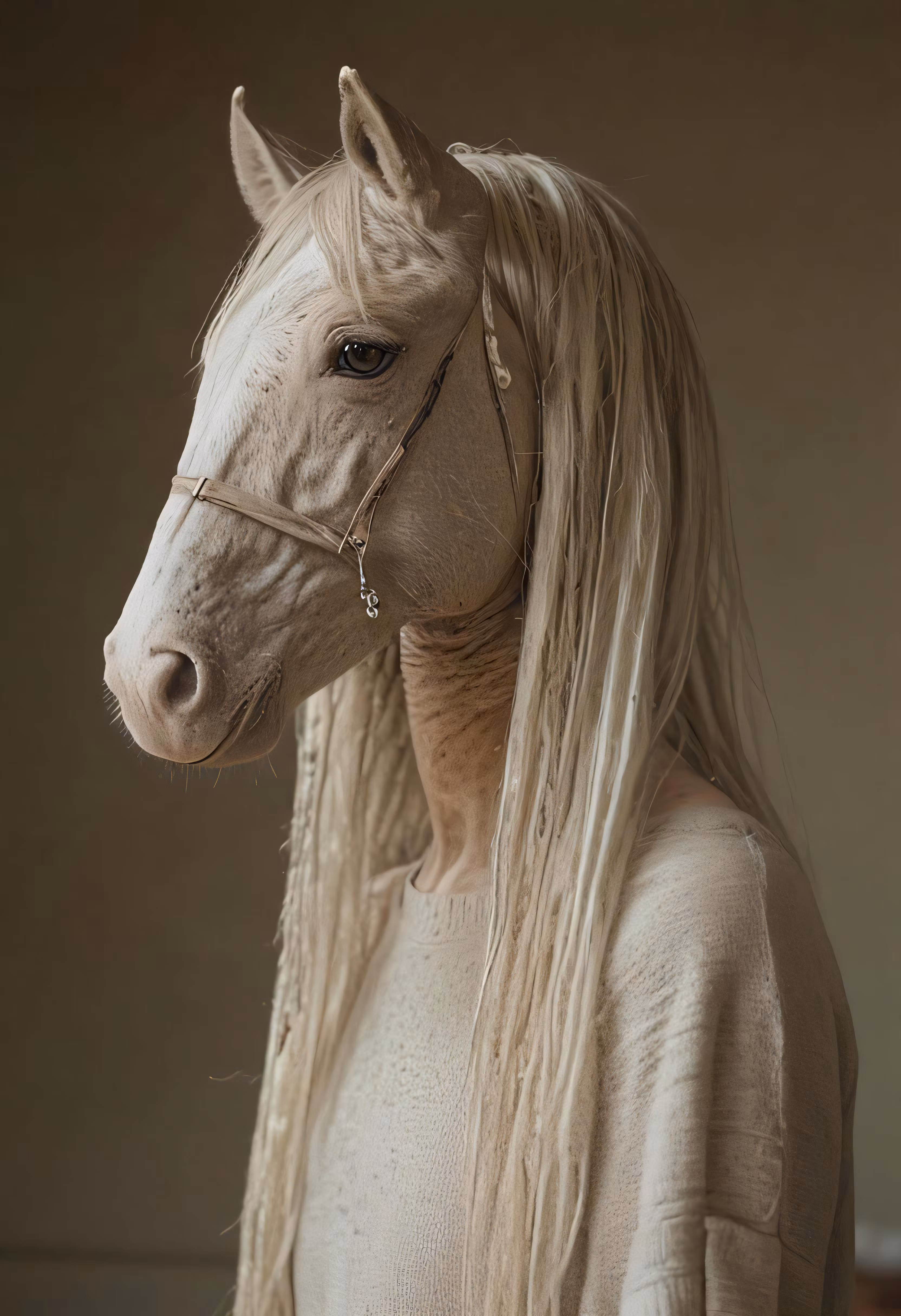 High resolution picture, free to use, a white horse with blond mane wearing a chain