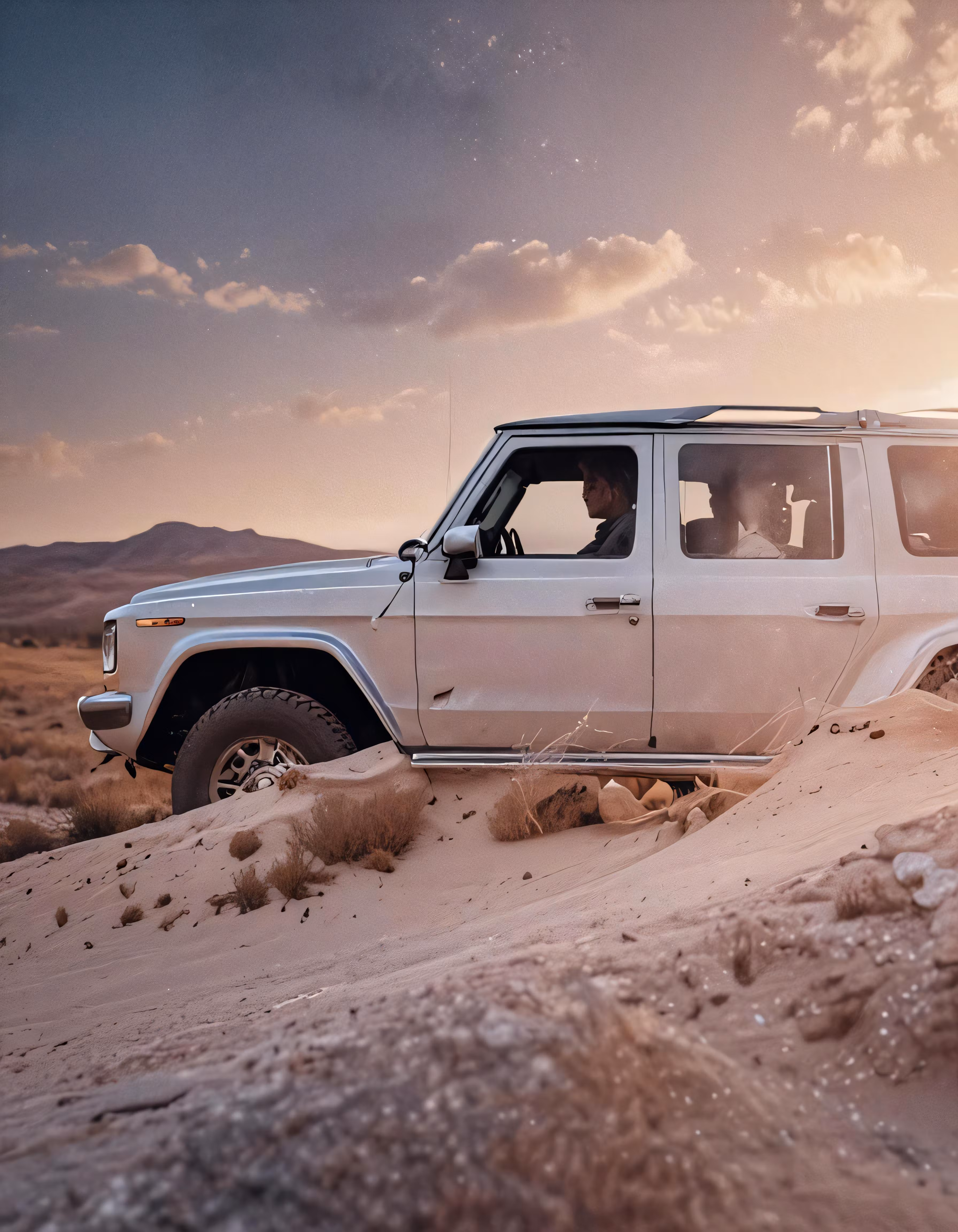 High resolution picture, free to use, a white jeep in the desert on a cloudy day