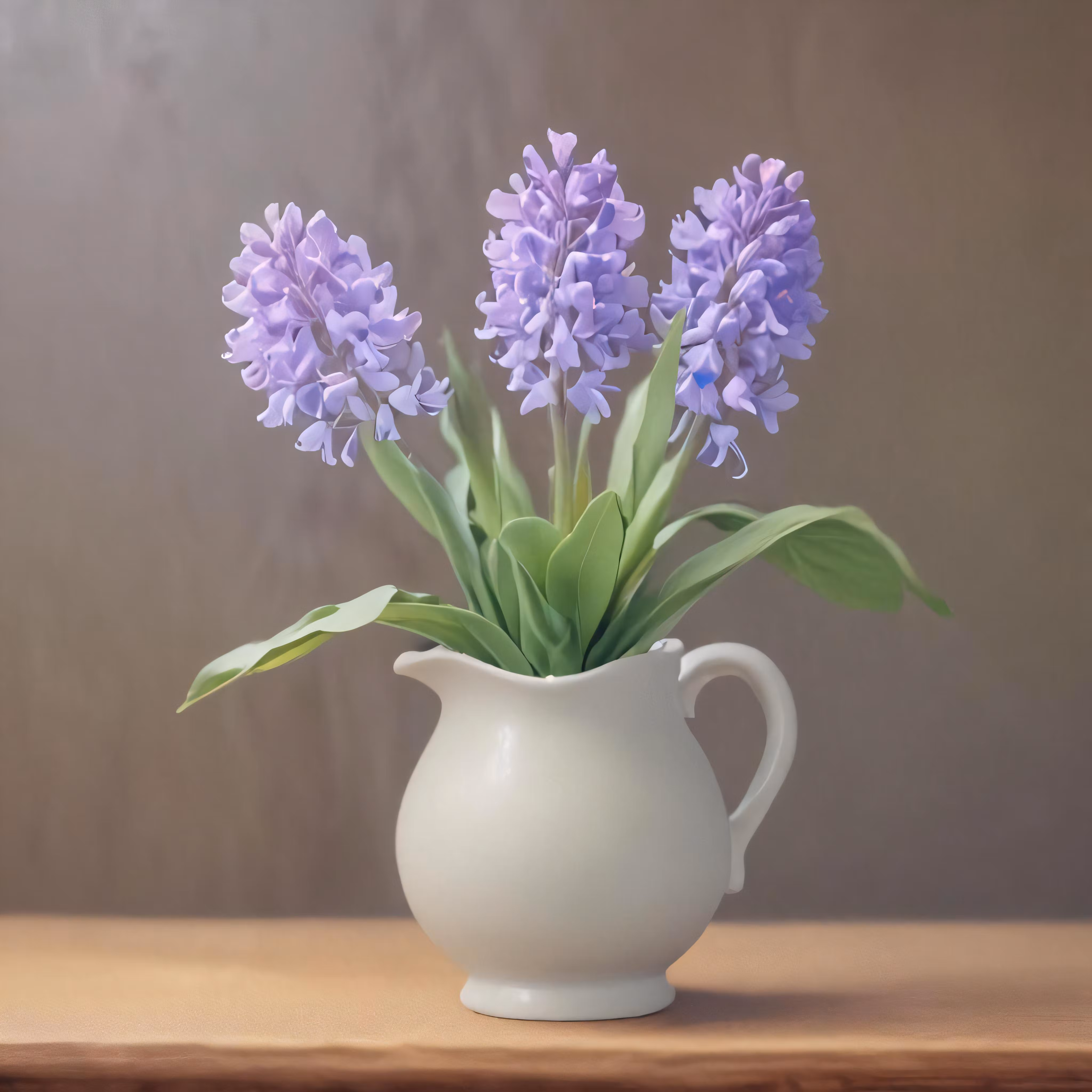 High resolution picture, free to use, a white jug filled with purple flowers on top of a table