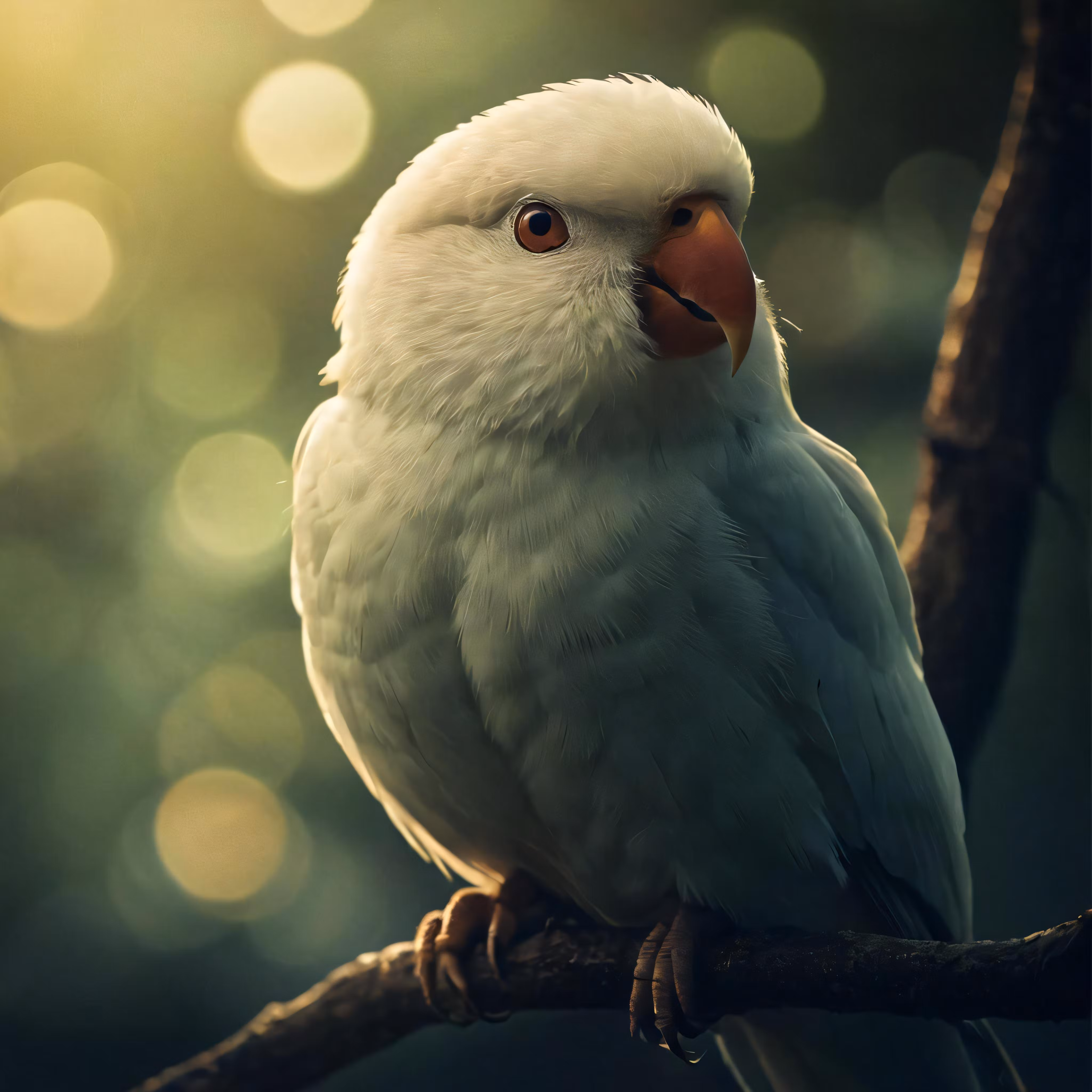 High resolution picture, free to use, a white parrot with a black head and red beak on a tree branch