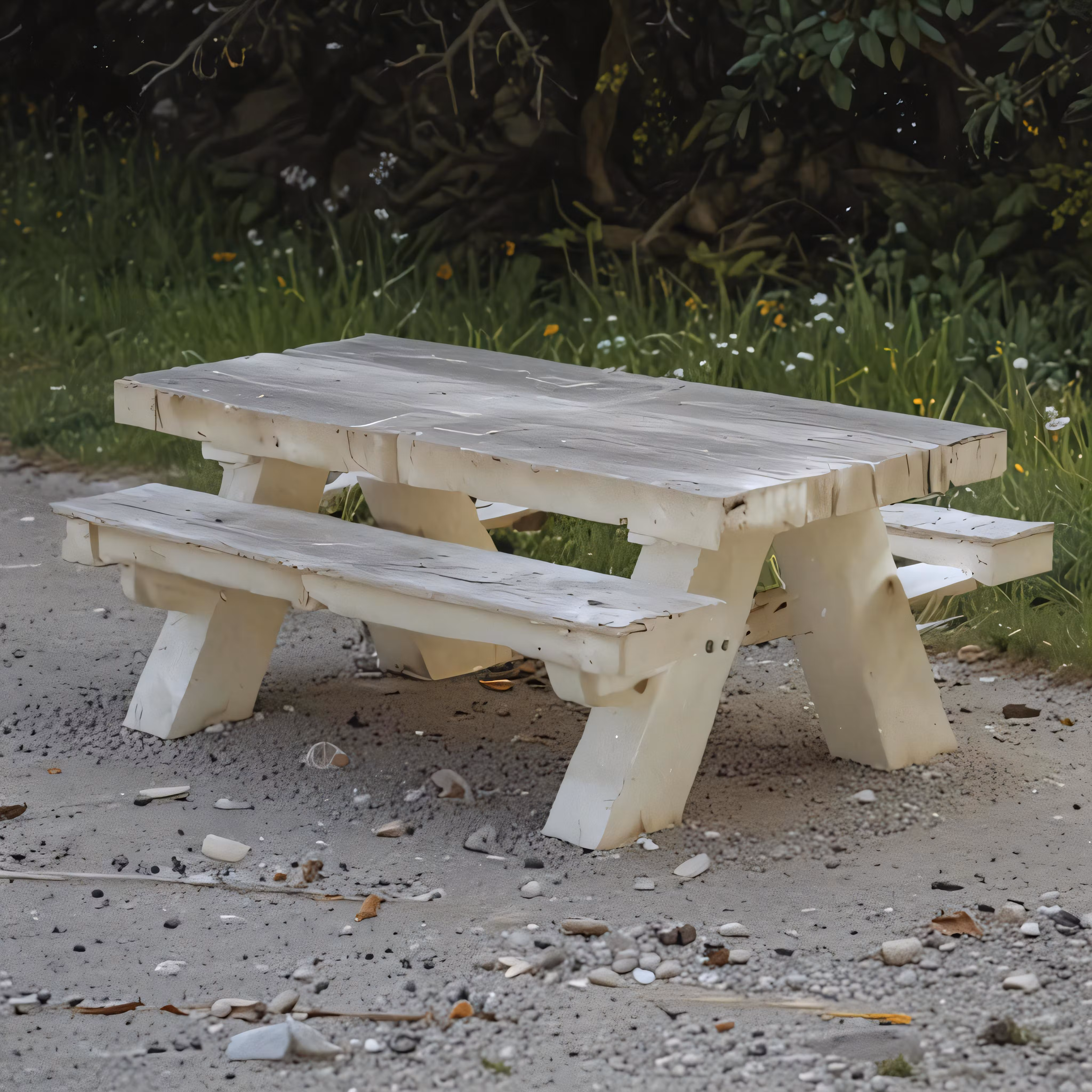 High resolution picture, free to use, a white picnic table set up on a gravel path