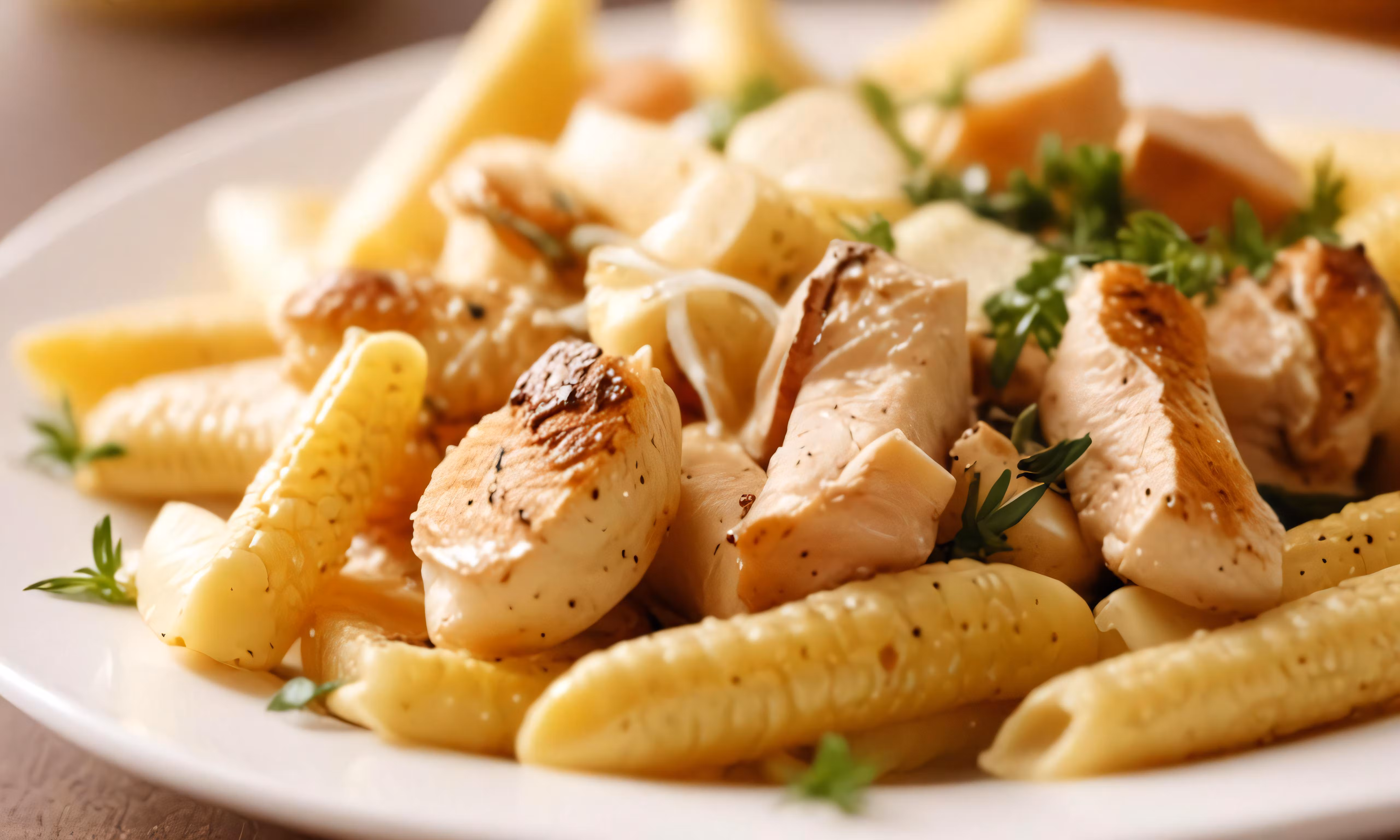 High resolution picture, free to use, a white plate topped with chicken and pasta
