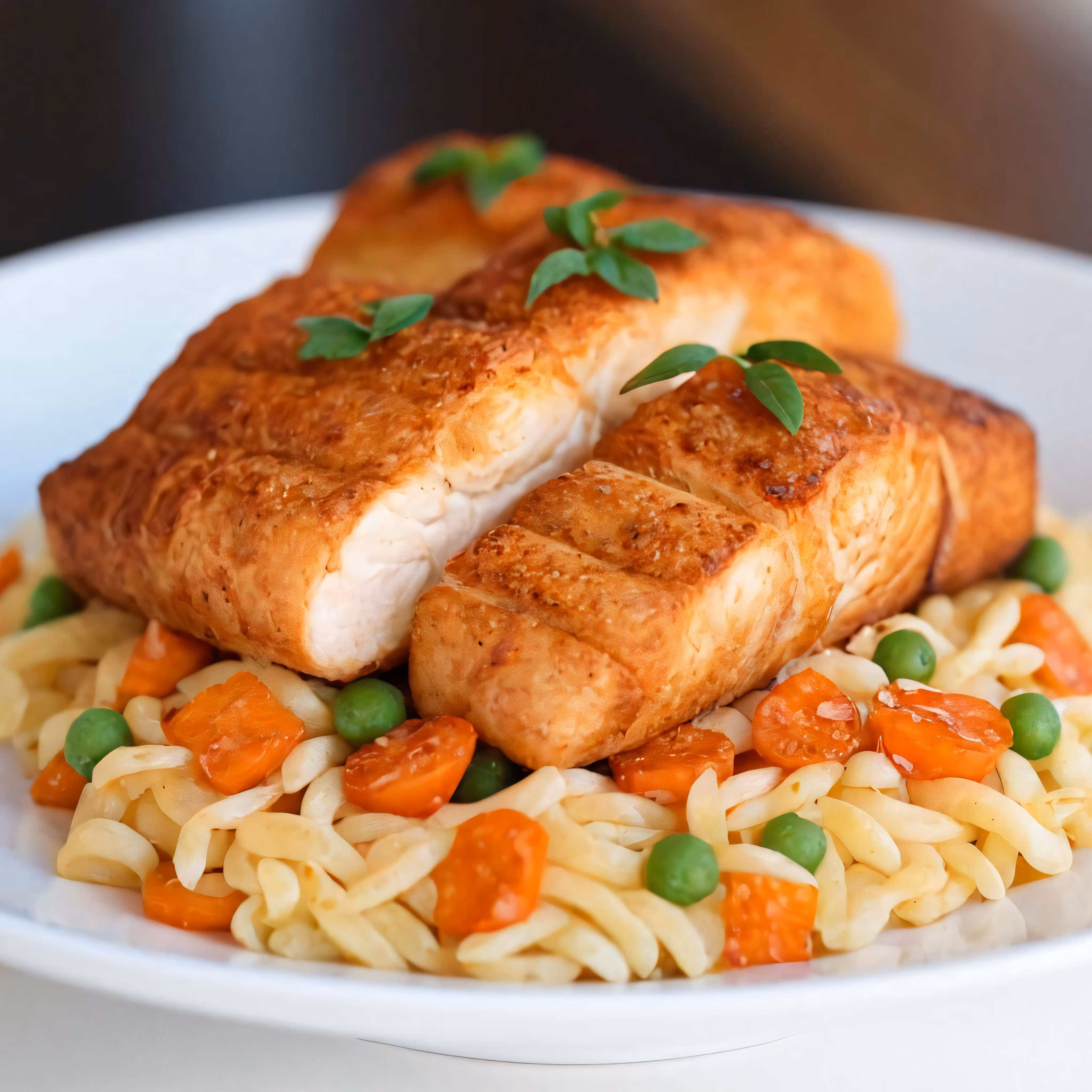 High resolution picture, free to use, a white plate topped with pasta and salmon