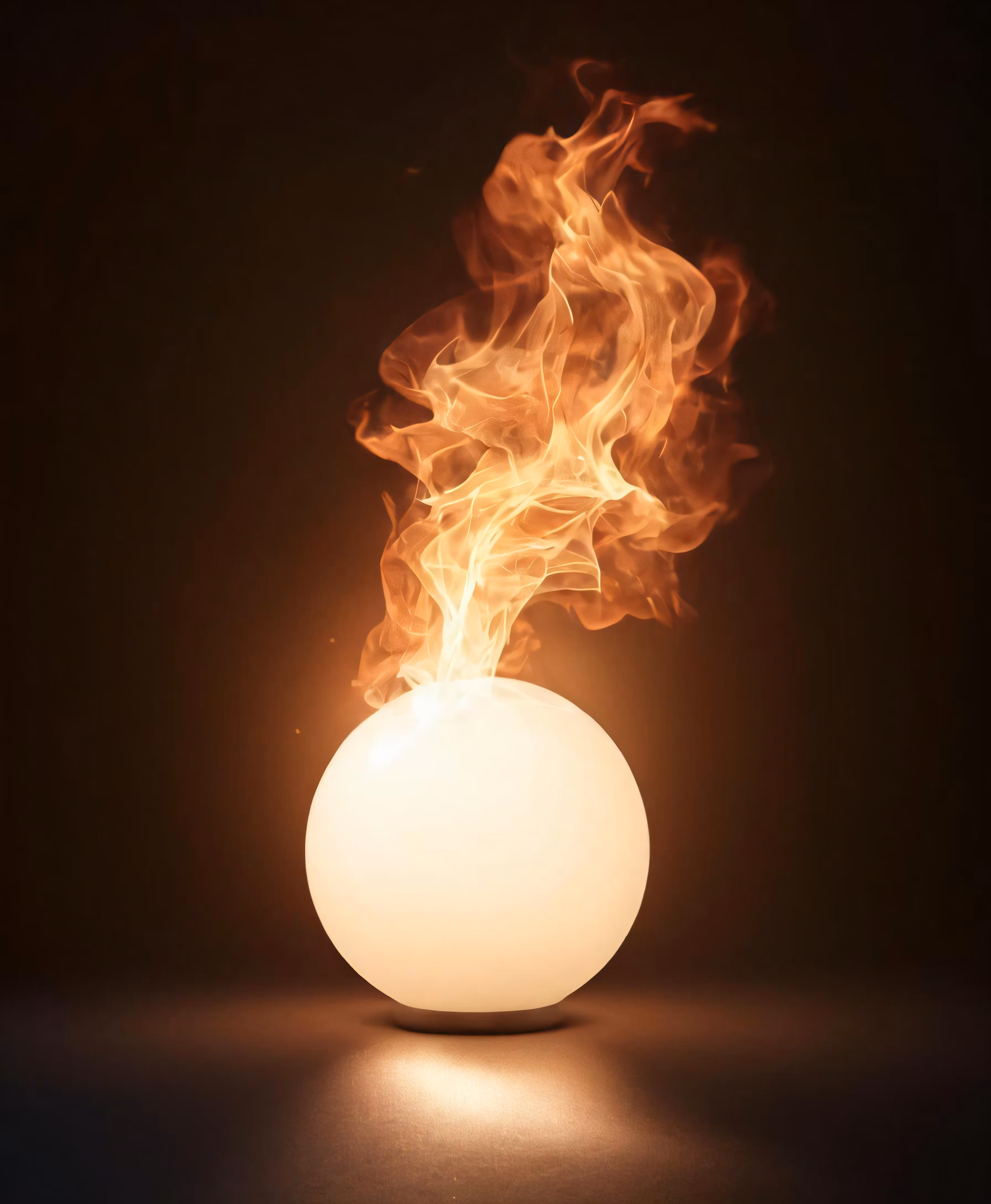 High resolution picture, free to use, a white sphere with orange flames inside on a black background
