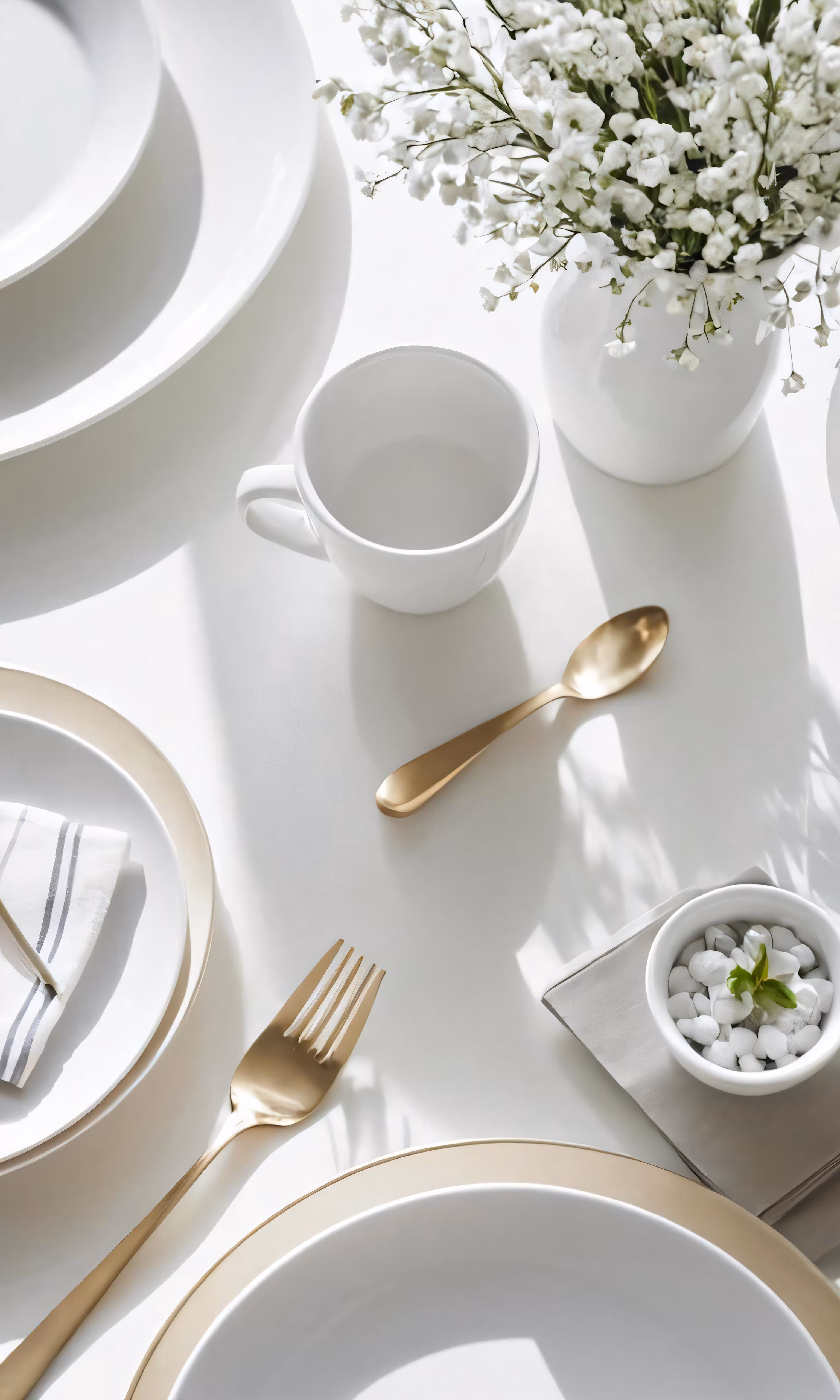 High resolution picture, free to use, a white table with place setting, goldware, napkins and cups