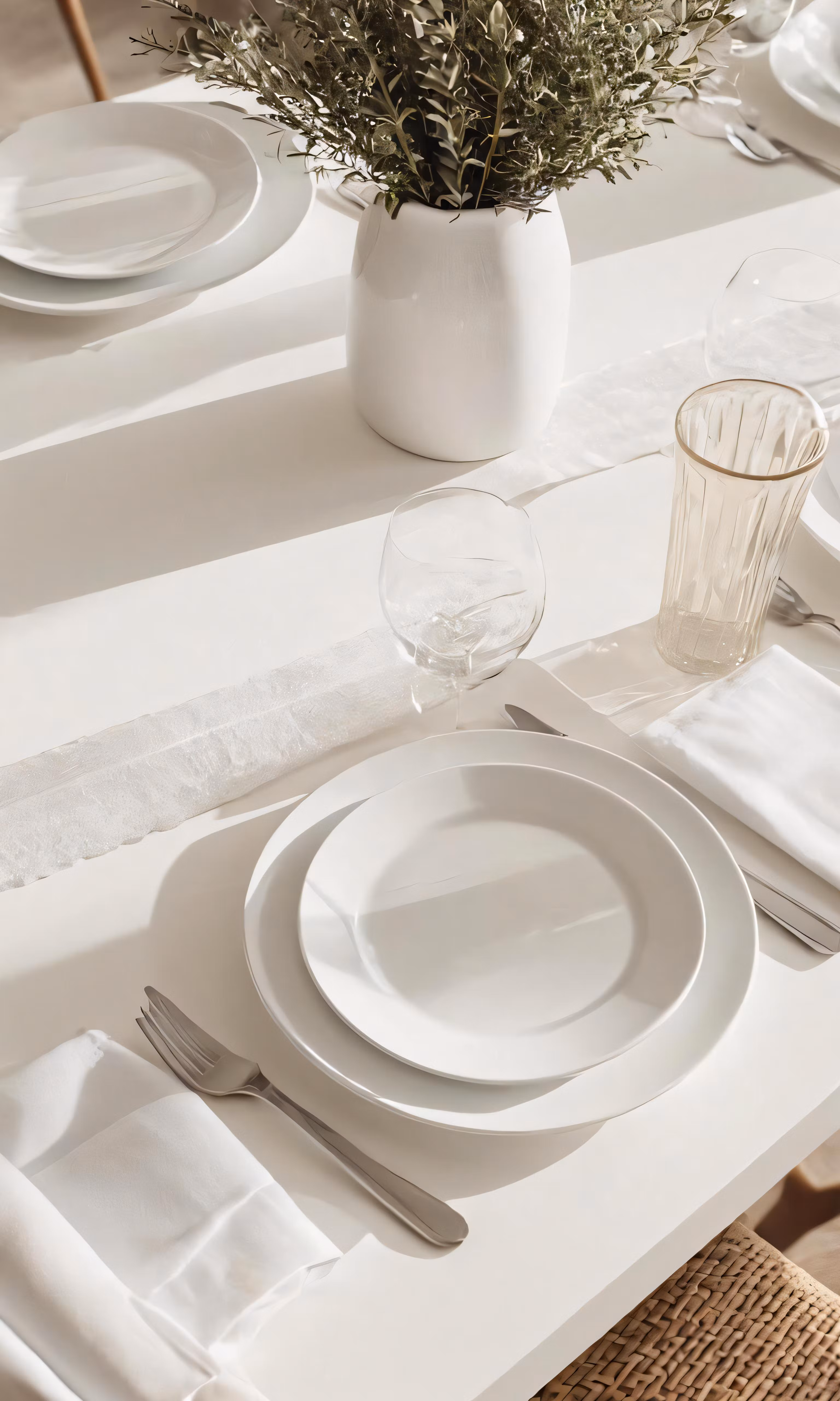 High resolution picture, free to use, a white table with two napkins and glasses with flowers on the plate