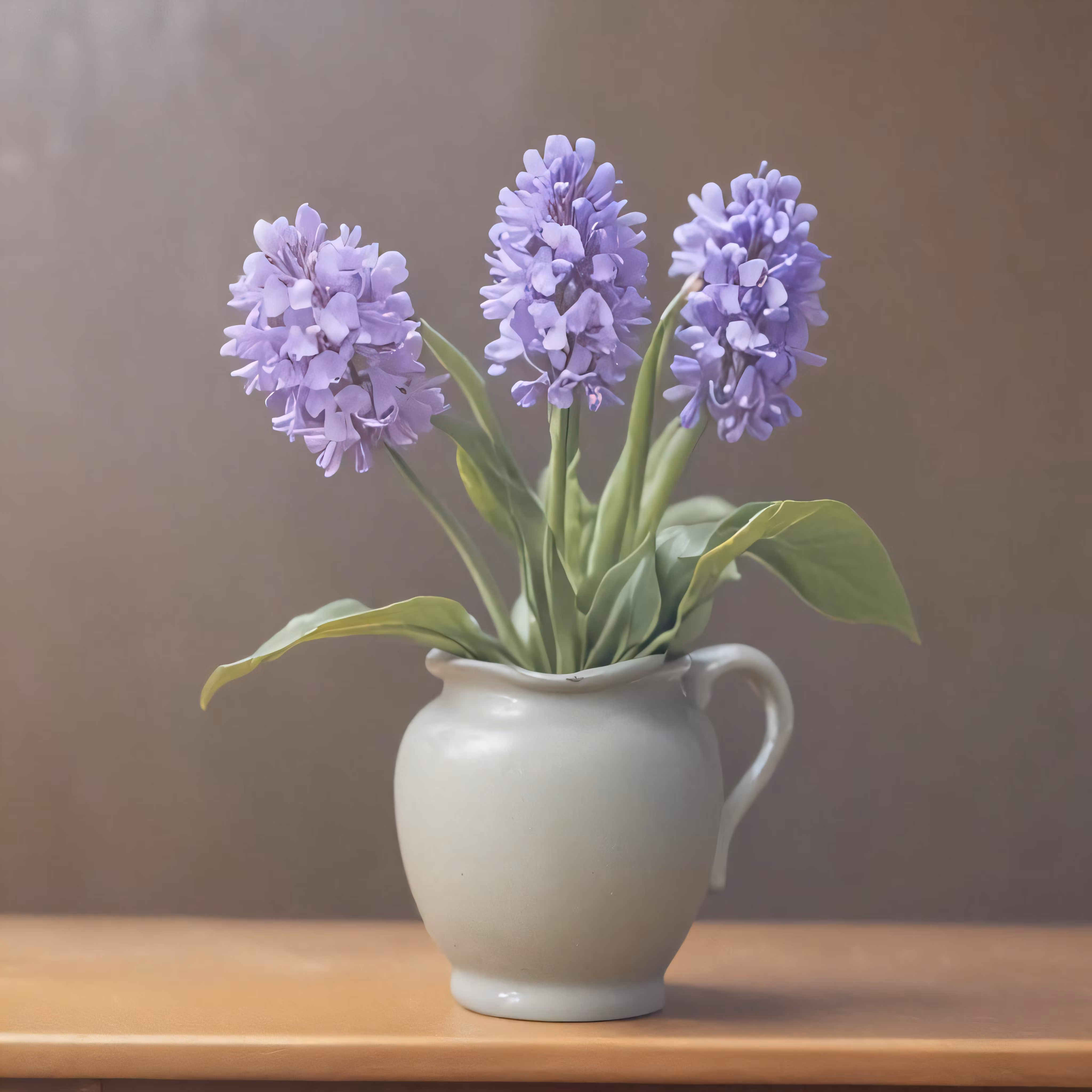 High resolution picture, free to use, a white vase holding a bunch of purple flowers