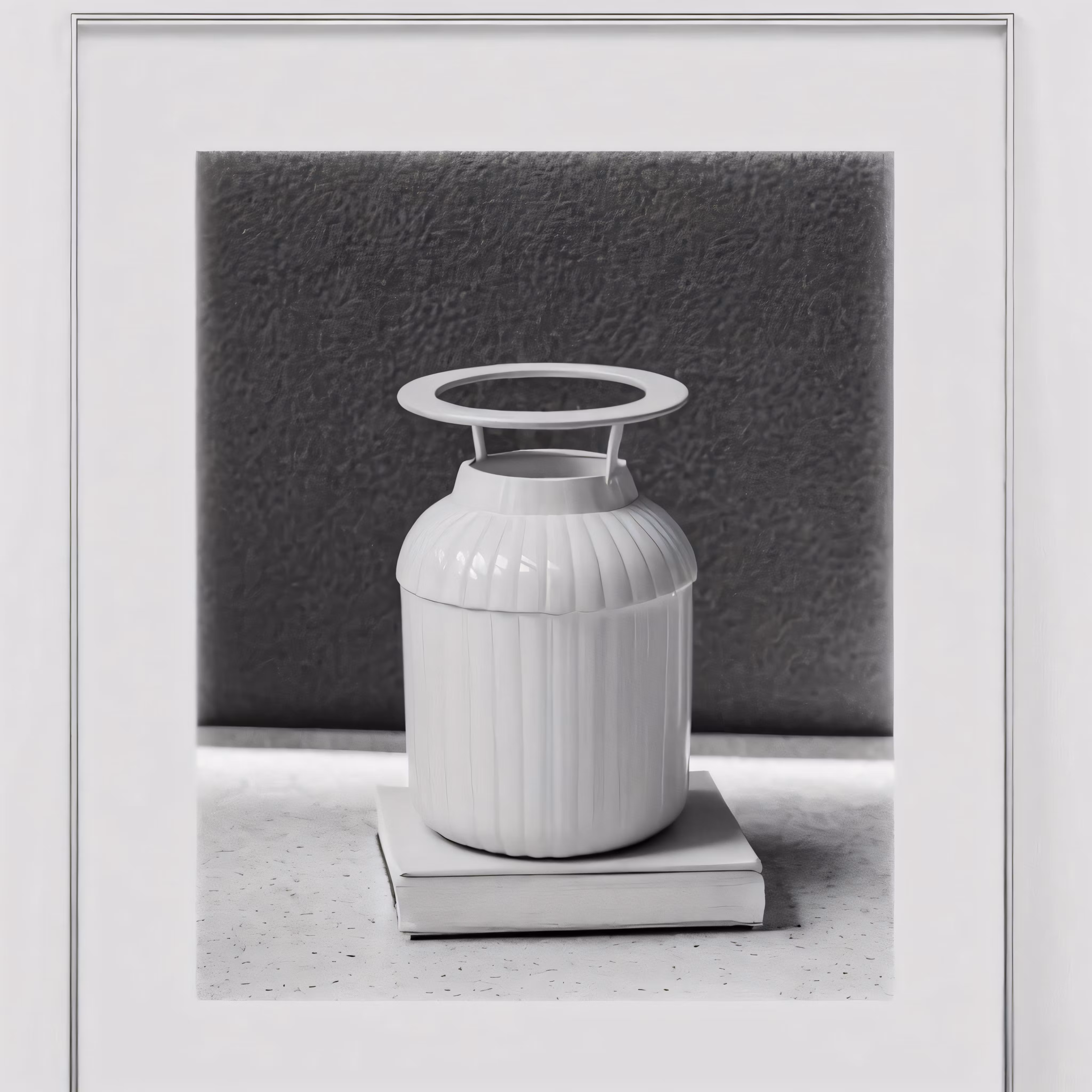 High resolution picture, free to use, a white vase with an odd head sitting on some books