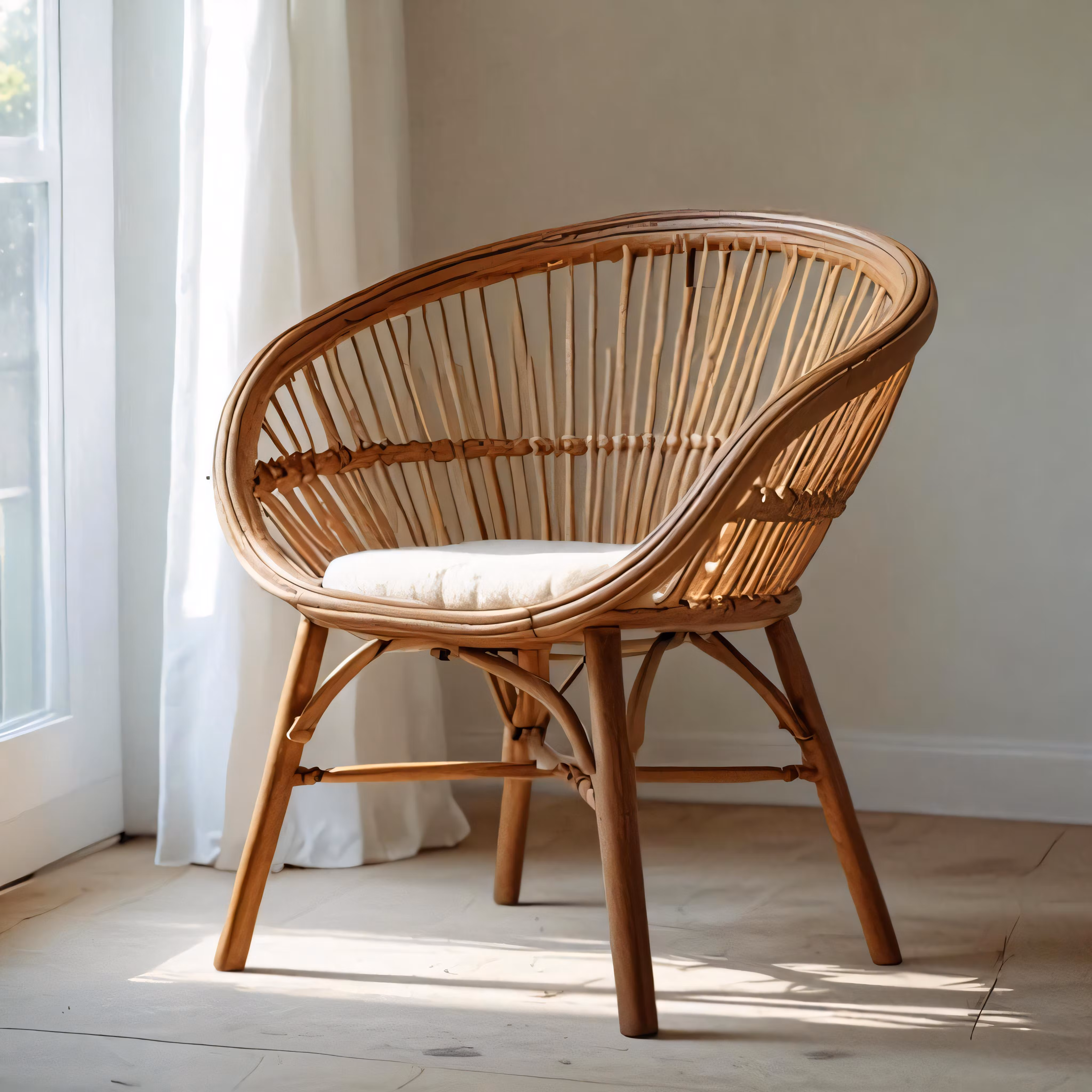 High resolution picture, free to use, a wicker chair and window with sheer curtains