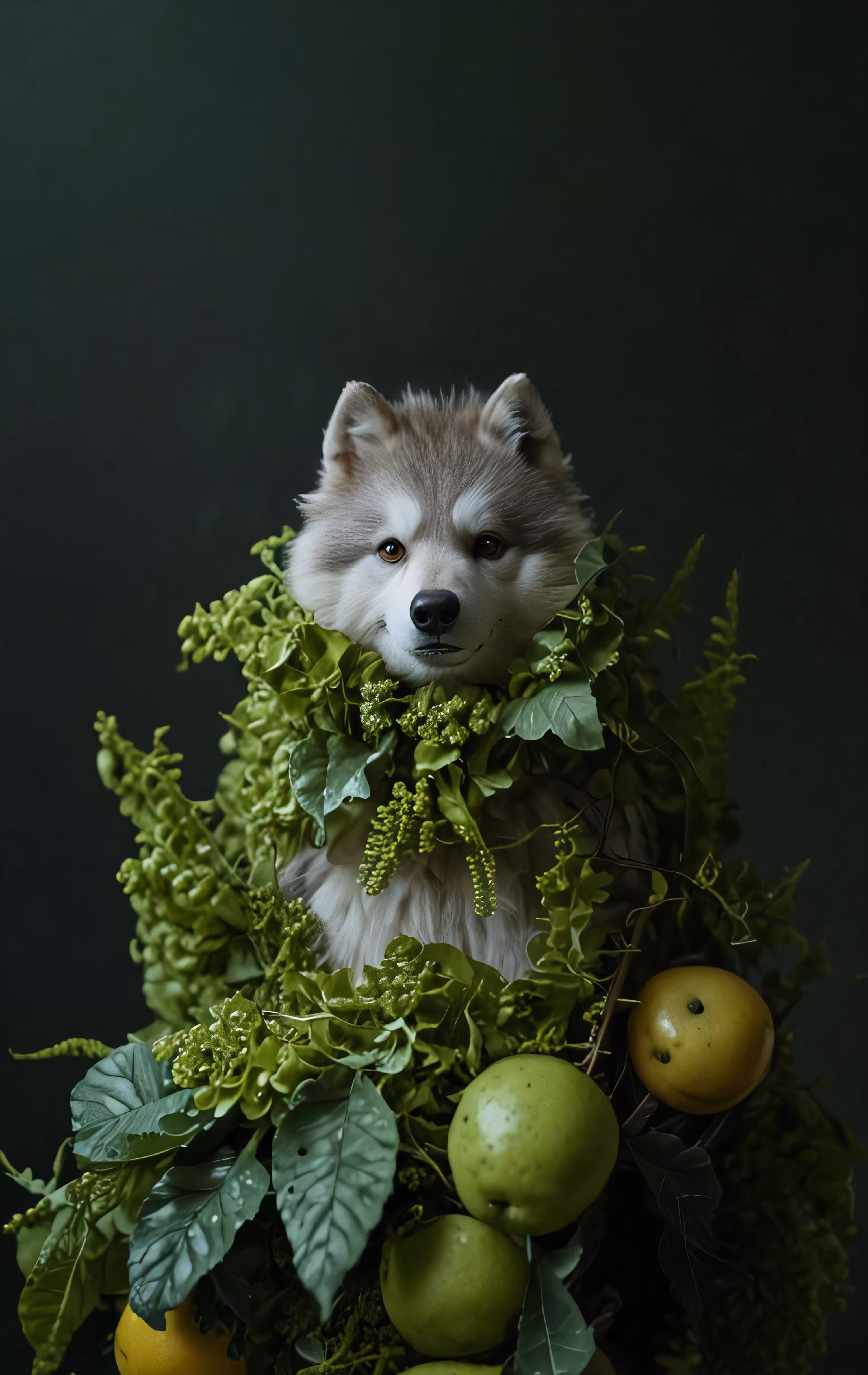 High resolution picture, free to use, a wolf is sitting in an assortment of fruit
