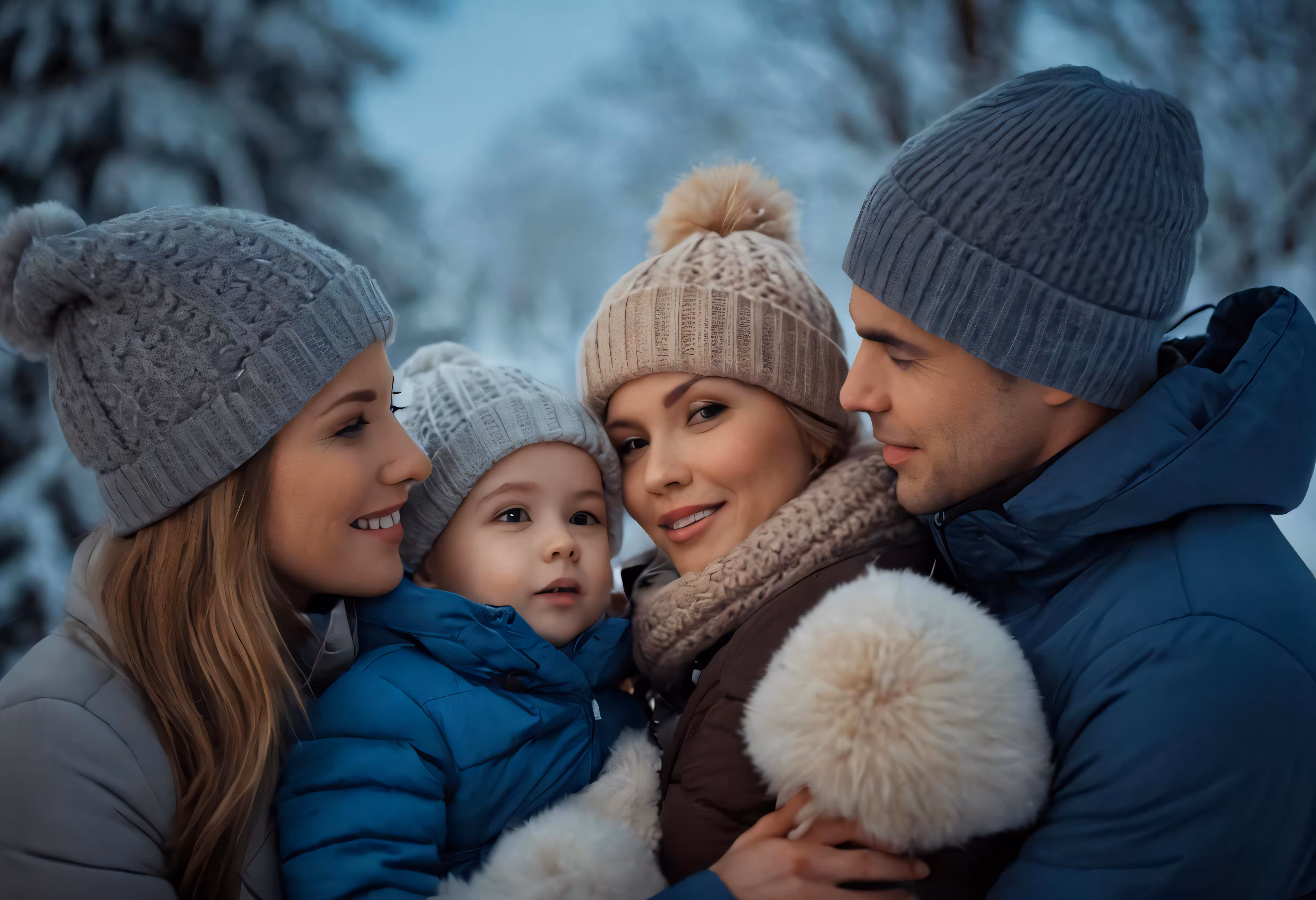 High resolution picture, free to use, a woman, man and two boys are wearing winter hats in the snow