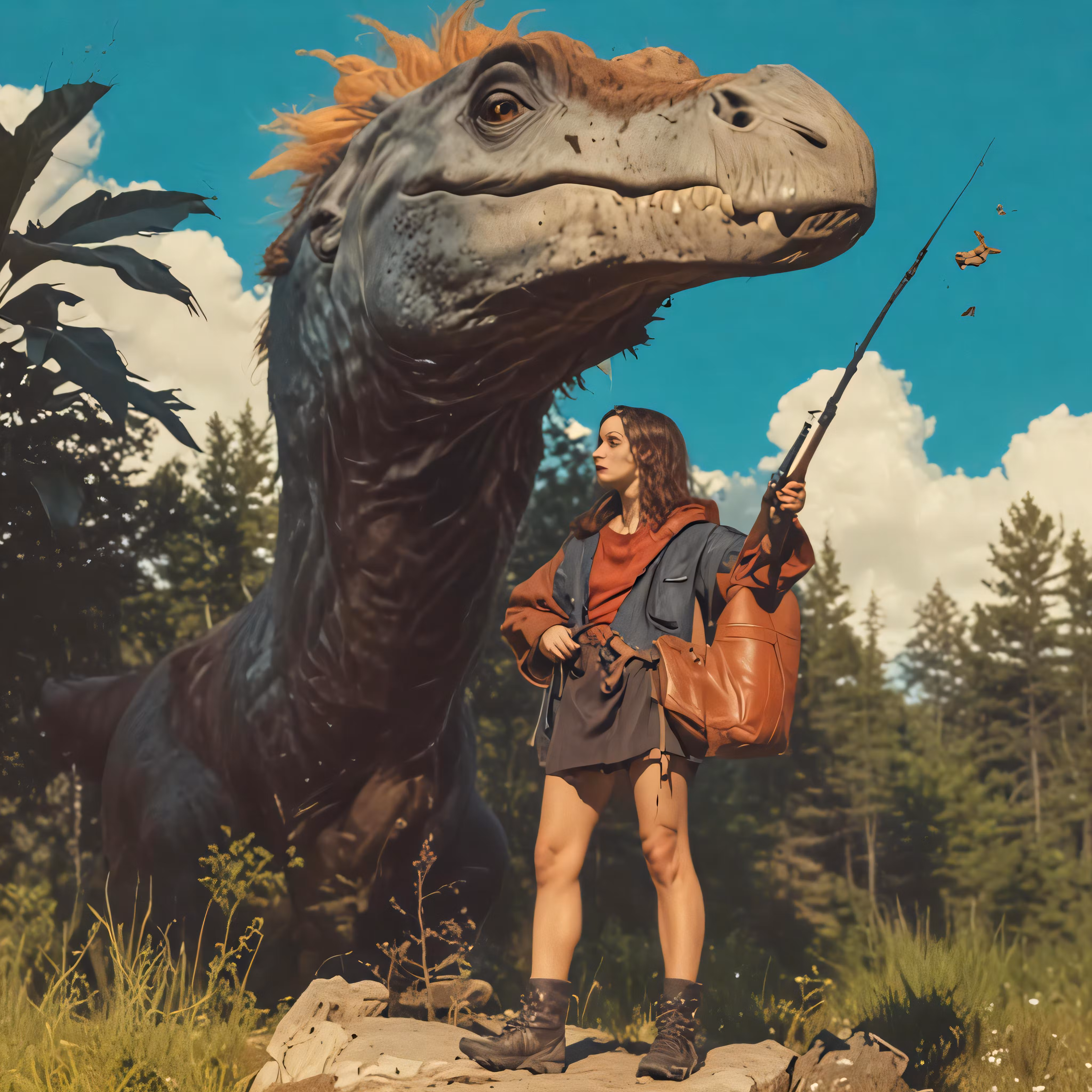 High resolution picture, free to use, a woman and a large dinosaur in a field