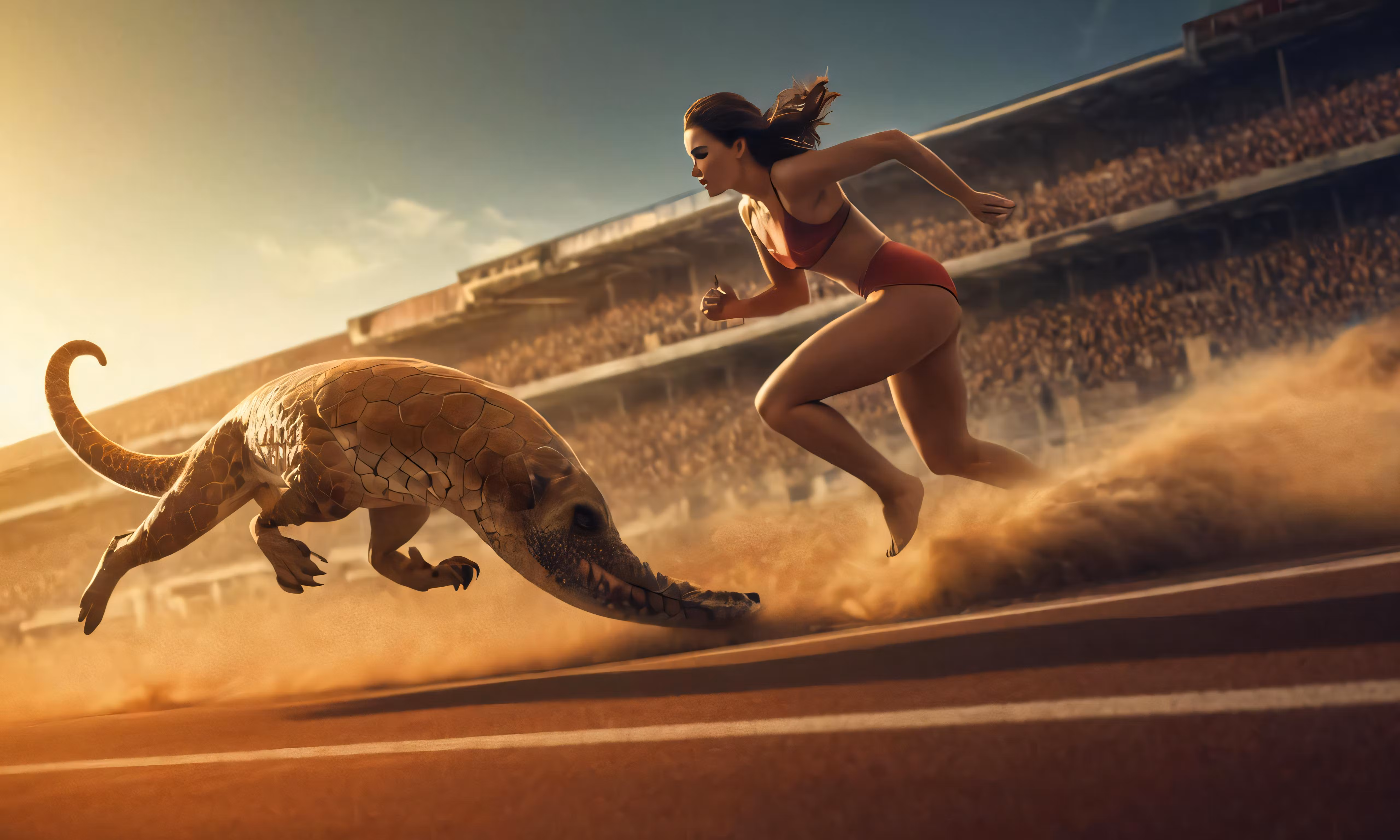 High resolution picture, free to use, a woman chasing a crocodile while a photographer photographs