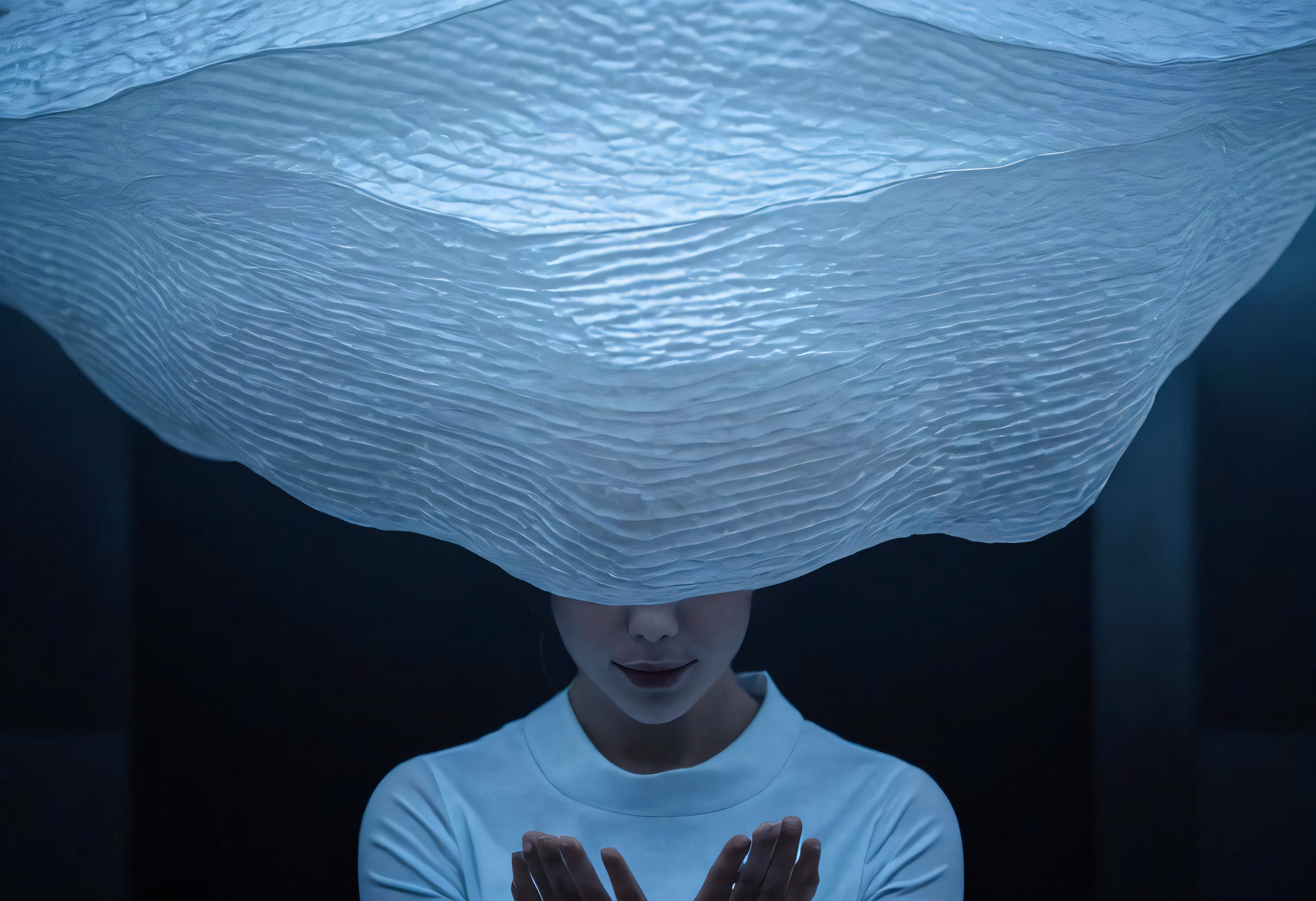 High resolution picture, free to use, a woman covering her face with a fabric covering the back of her head