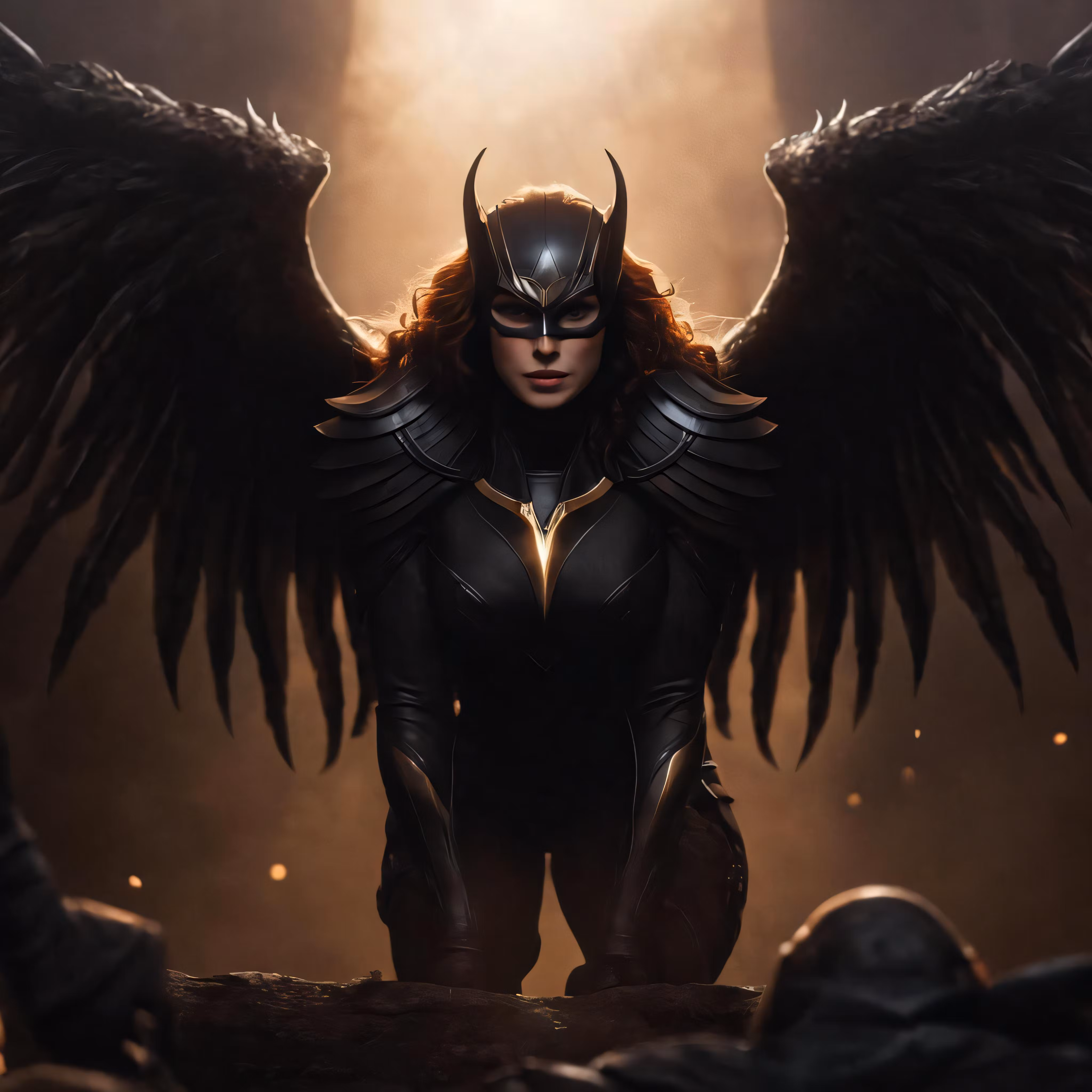 High resolution picture, free to use, a woman dressed as a dark angel is standing in front of a bright light