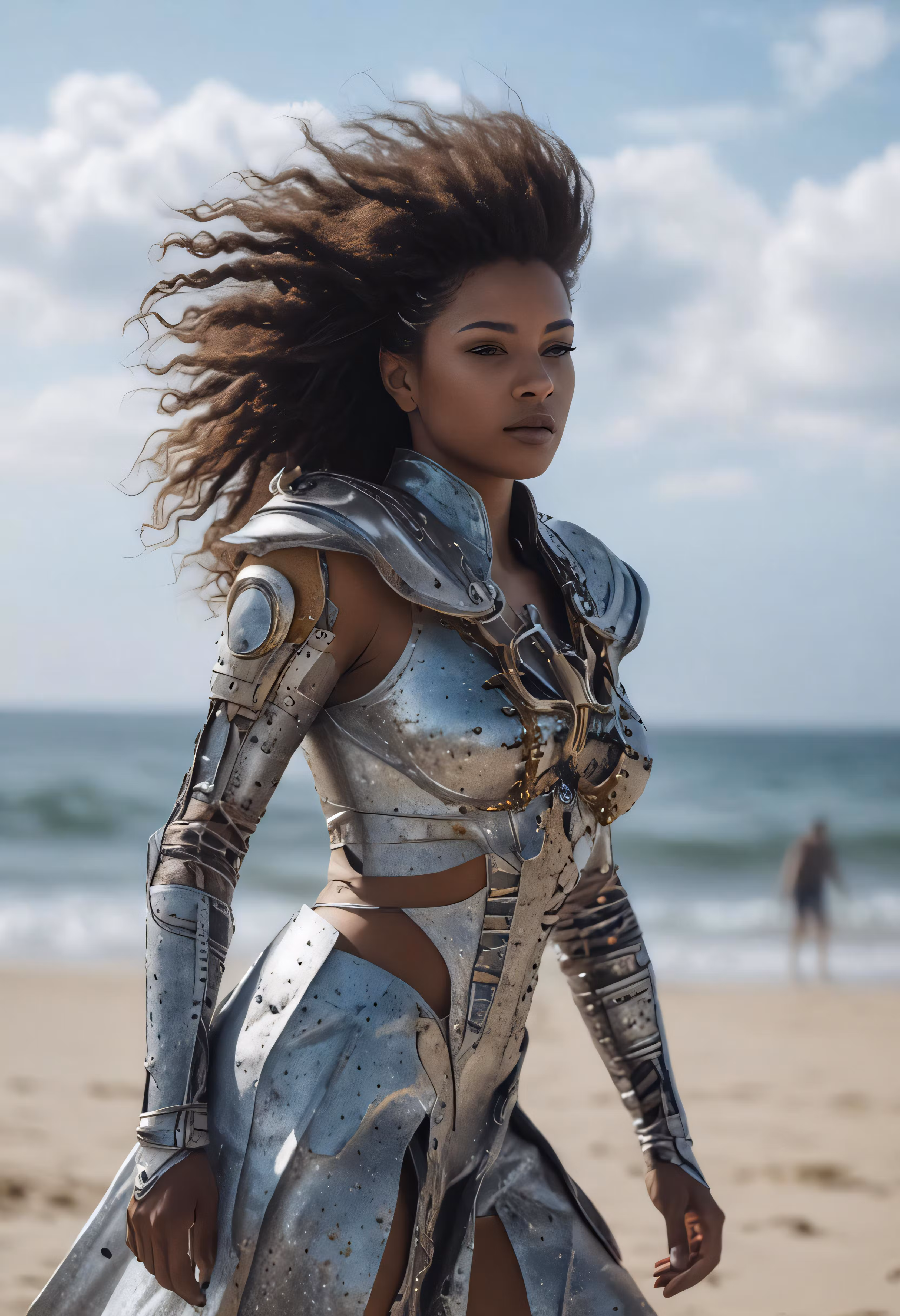 High resolution picture, free to use, a woman dressed as a knight walking along the beach
