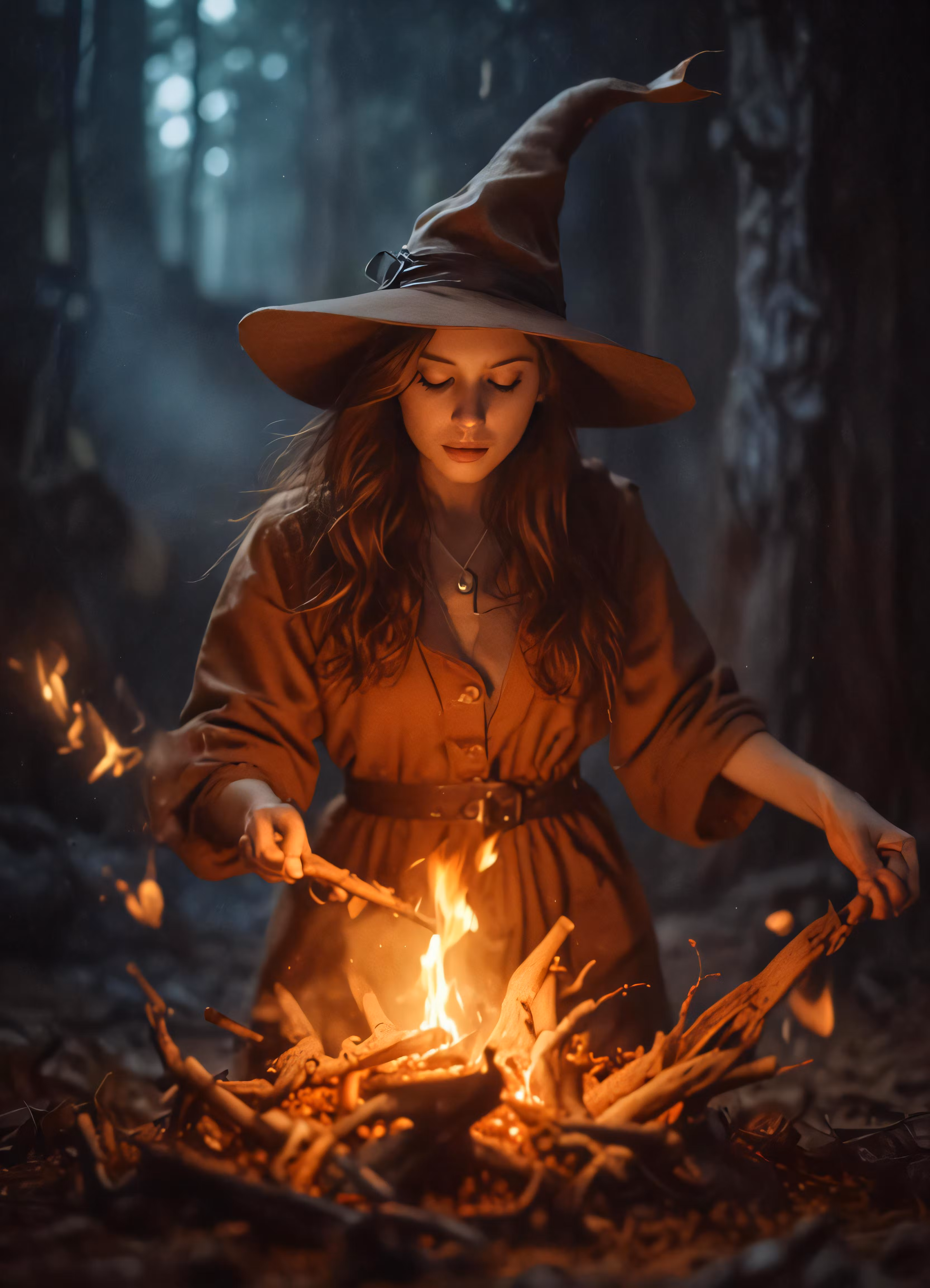 High resolution picture, free to use, a woman dressed in a brown dress and hat is holding fire