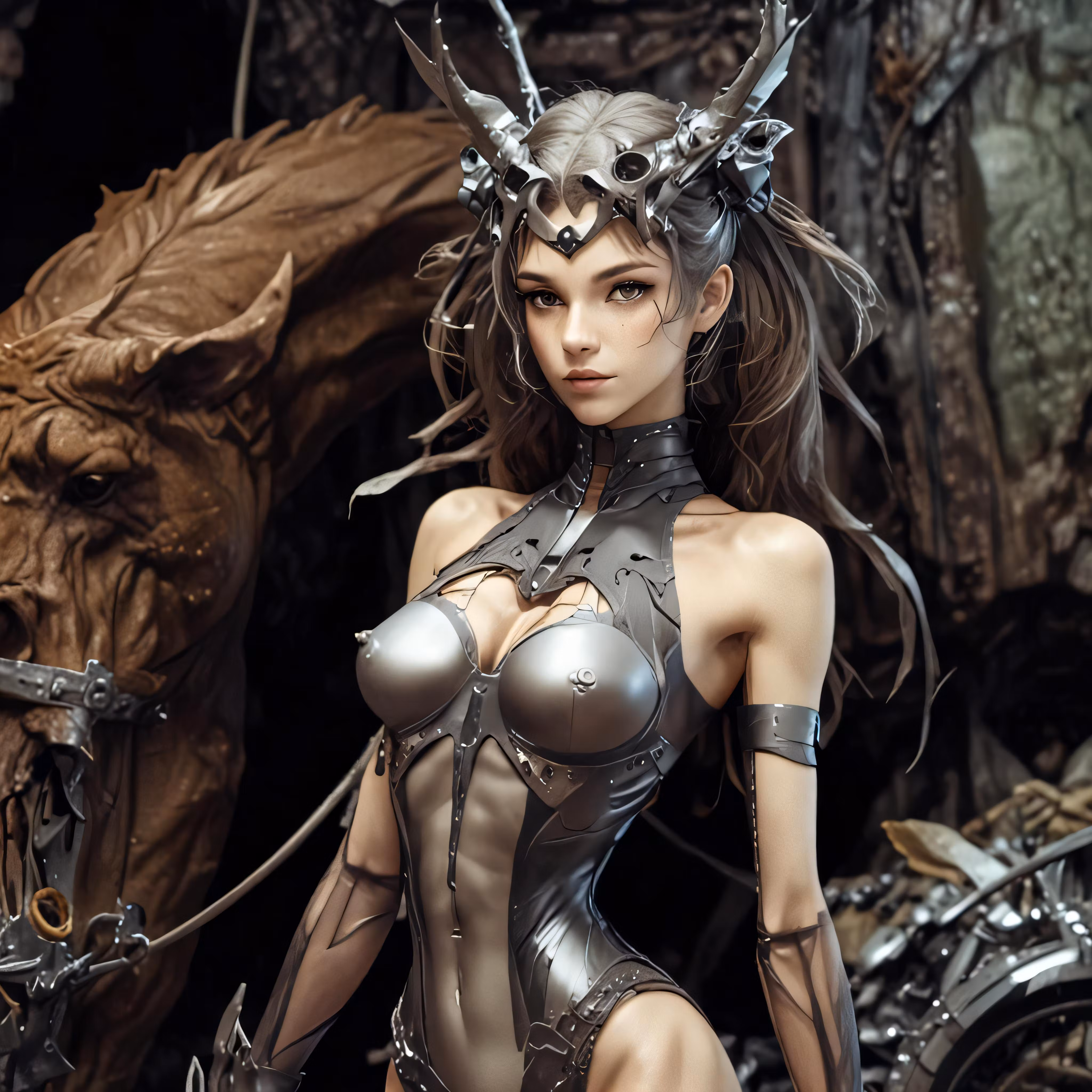 High resolution picture, free to use, a woman dressed in a metallic outfit with horns