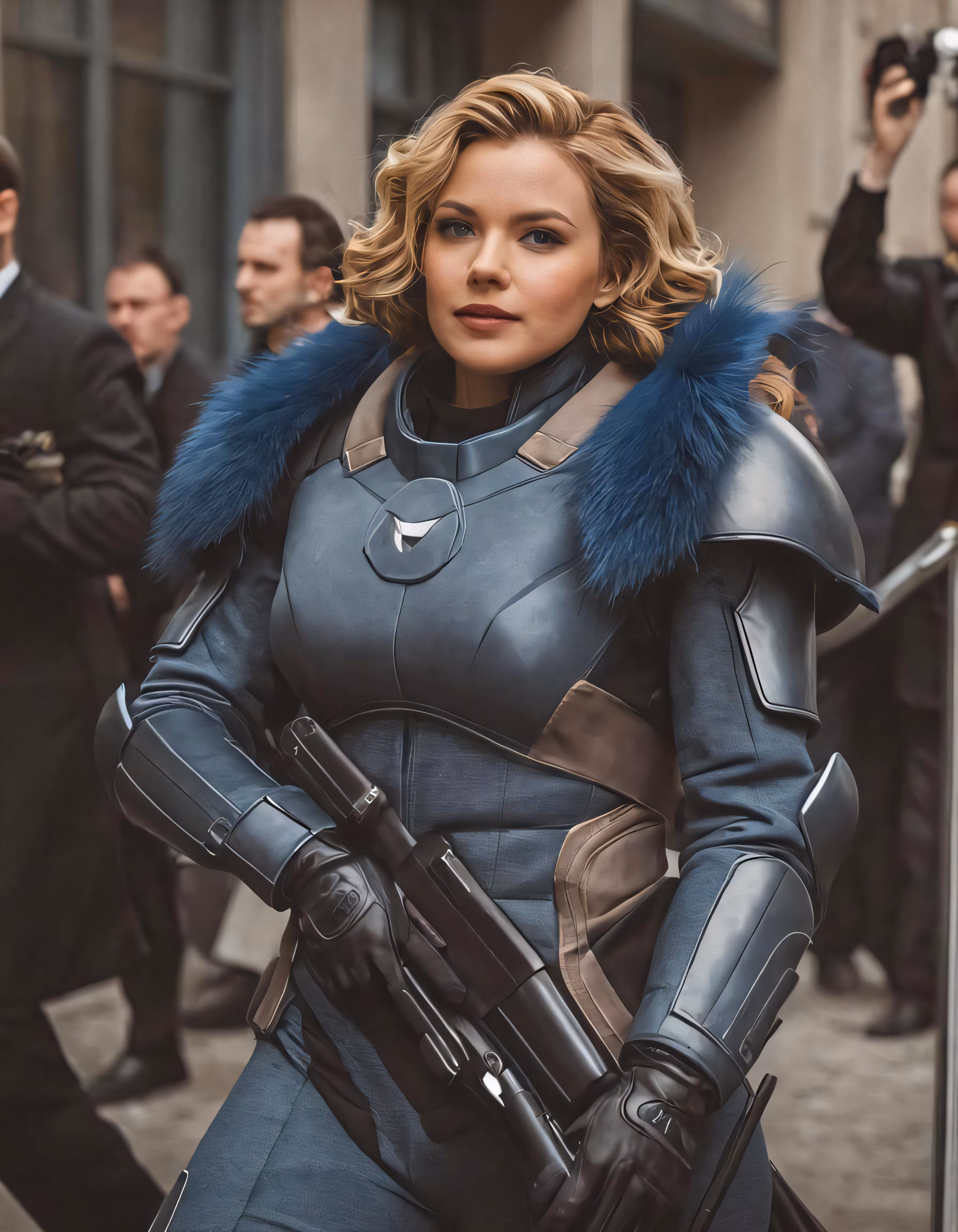 High resolution picture, free to use, a woman dressed in an ant   man outfit and holding a gun