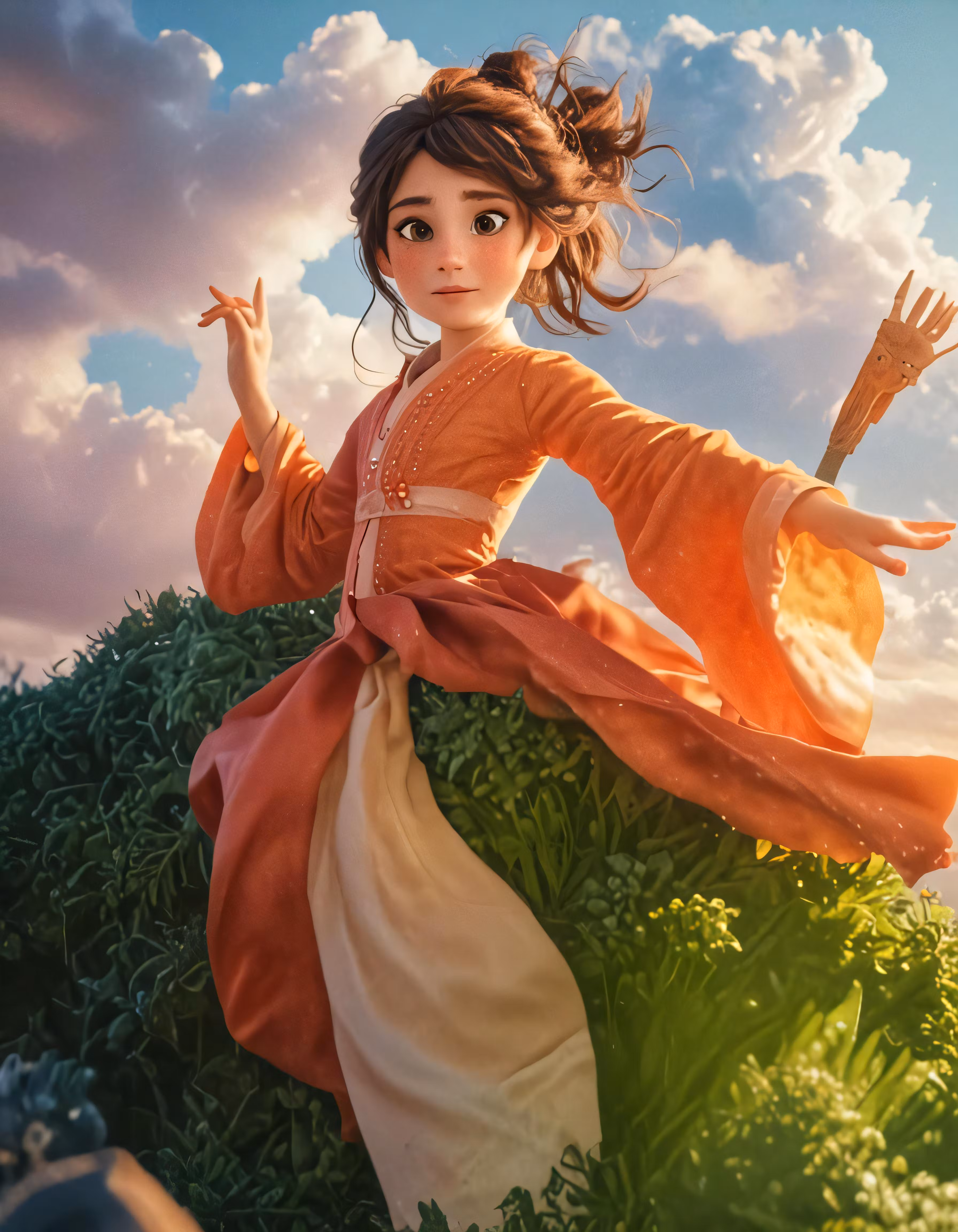High resolution picture, free to use, a woman dressed in an orange dress is sitting in the grass