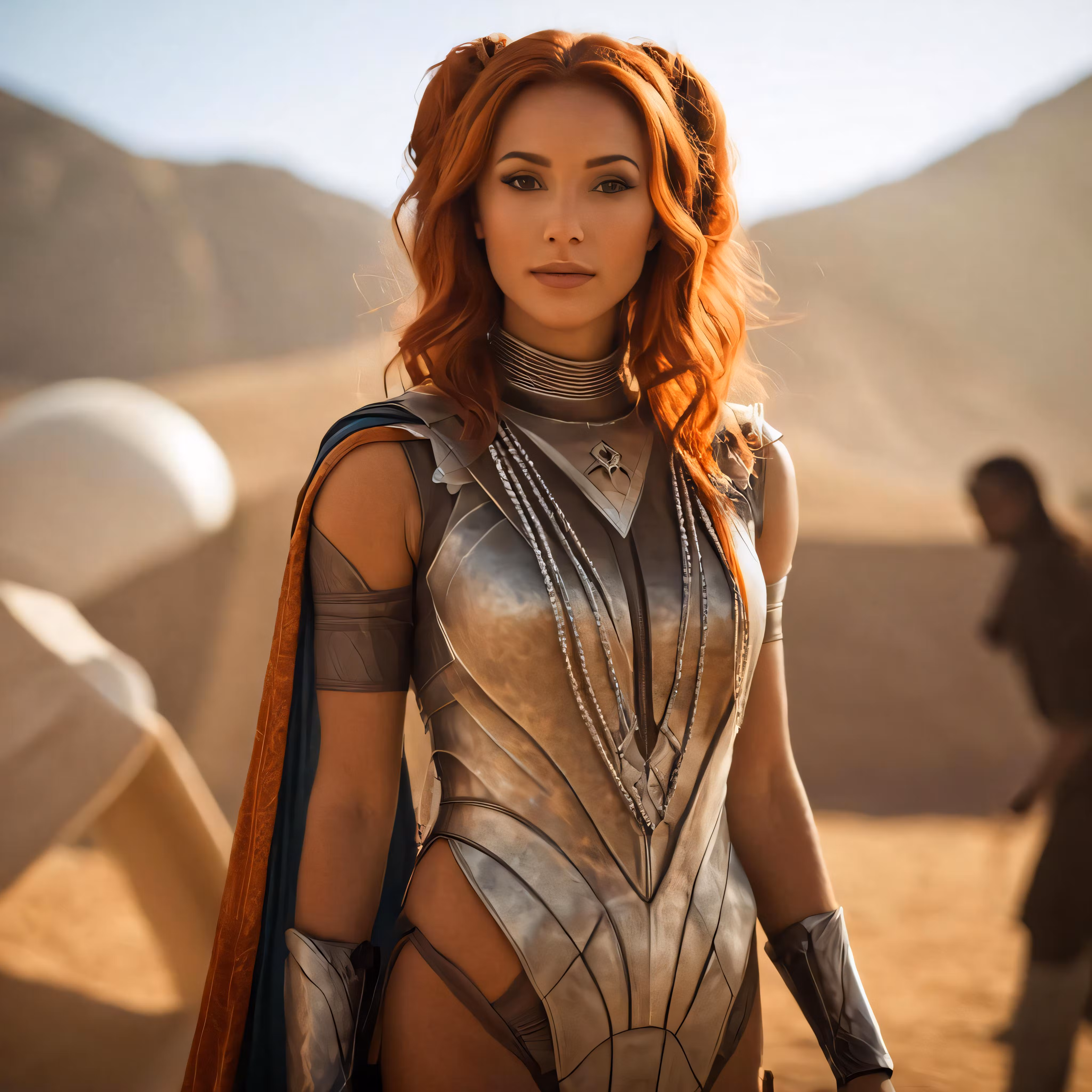 High resolution picture, free to use, a woman dressed in armor and standing next to an older man