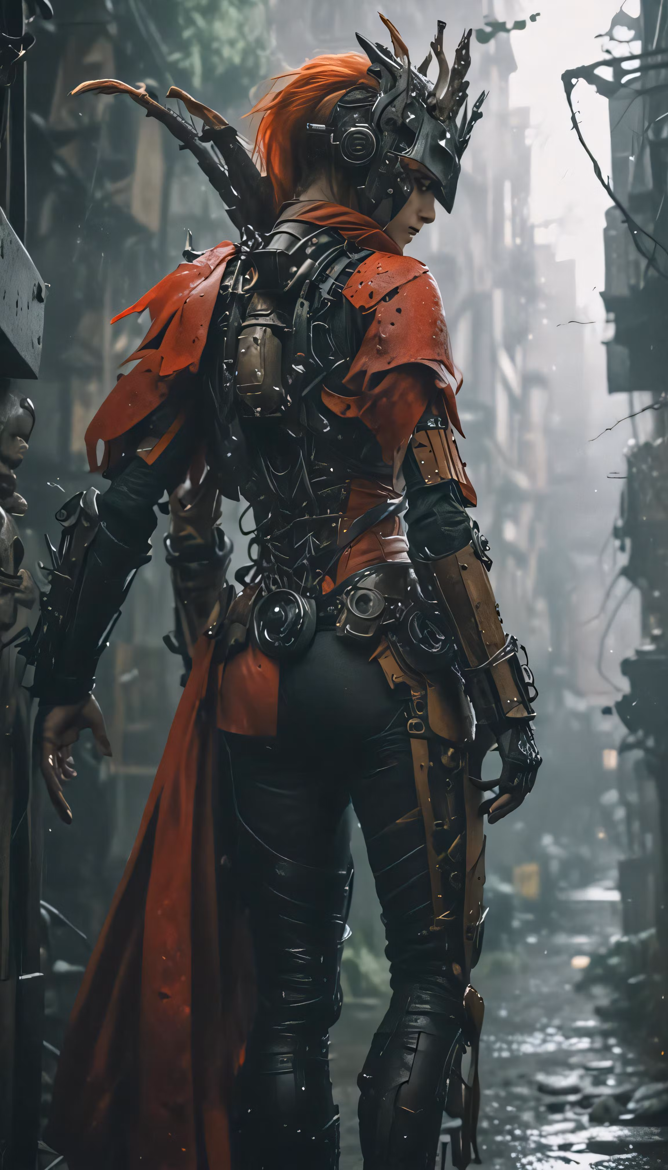 High resolution picture, free to use, a woman dressed in armor walking down the street