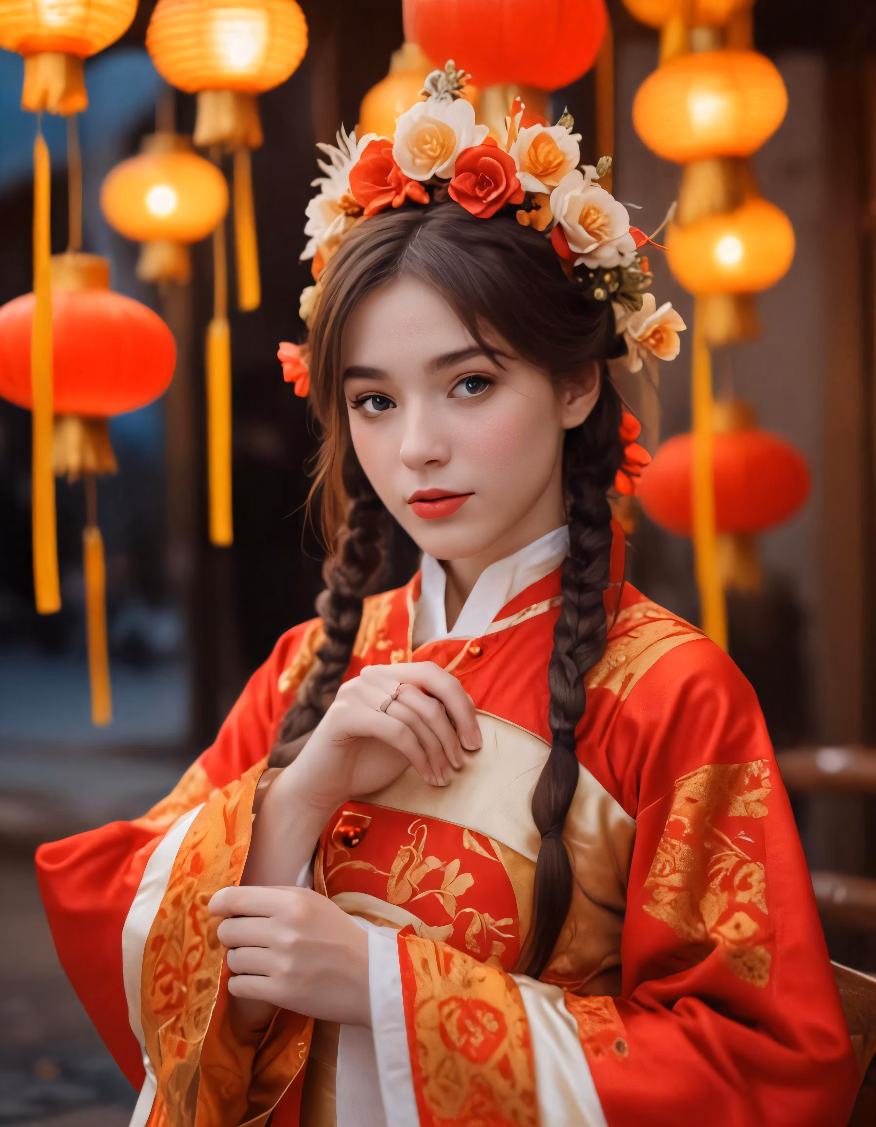 High resolution picture, free to use, a woman dressed in traditional chinese dress standing in front of lanterns