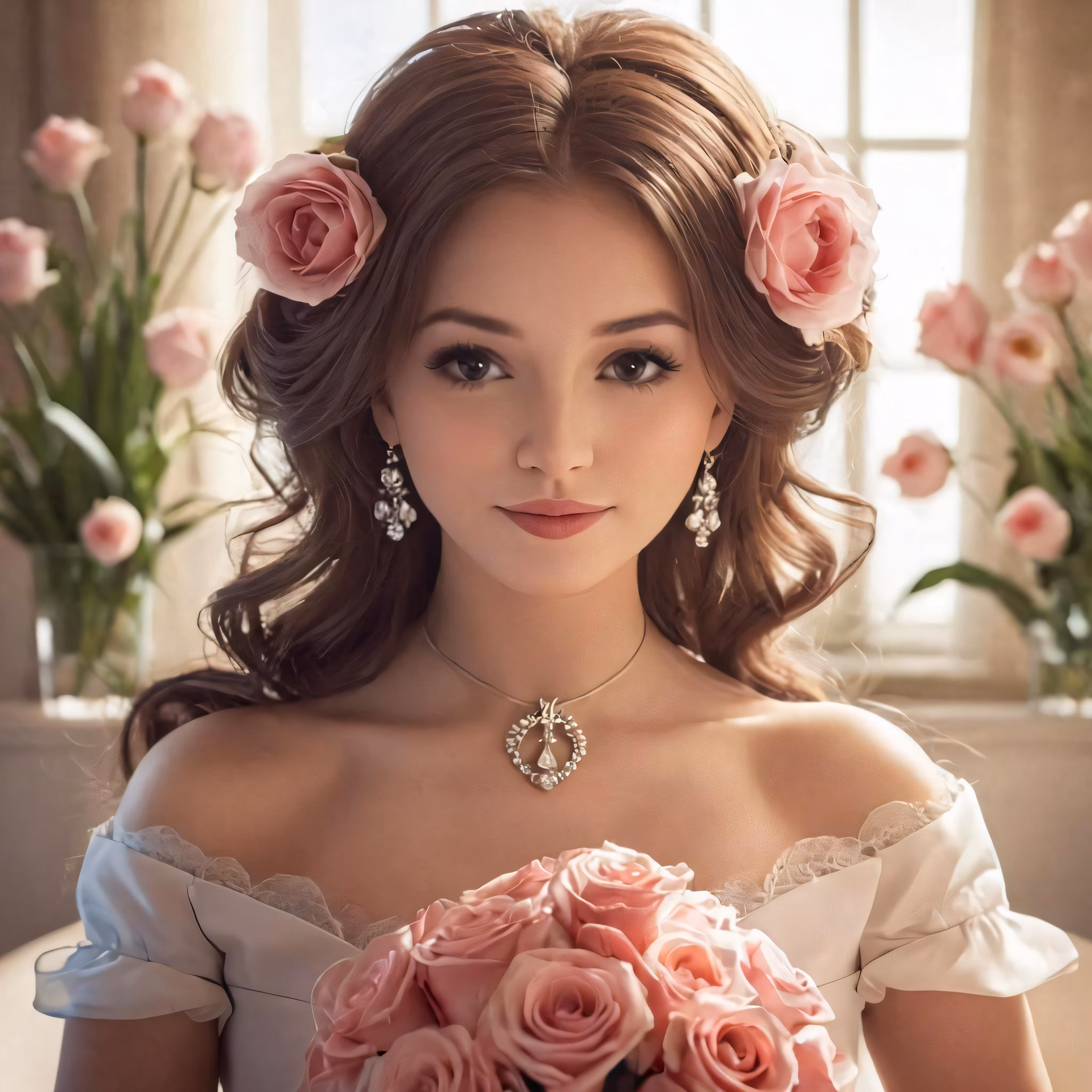 High resolution picture, free to use, a woman dressed in white holding pink flowers and necklaces