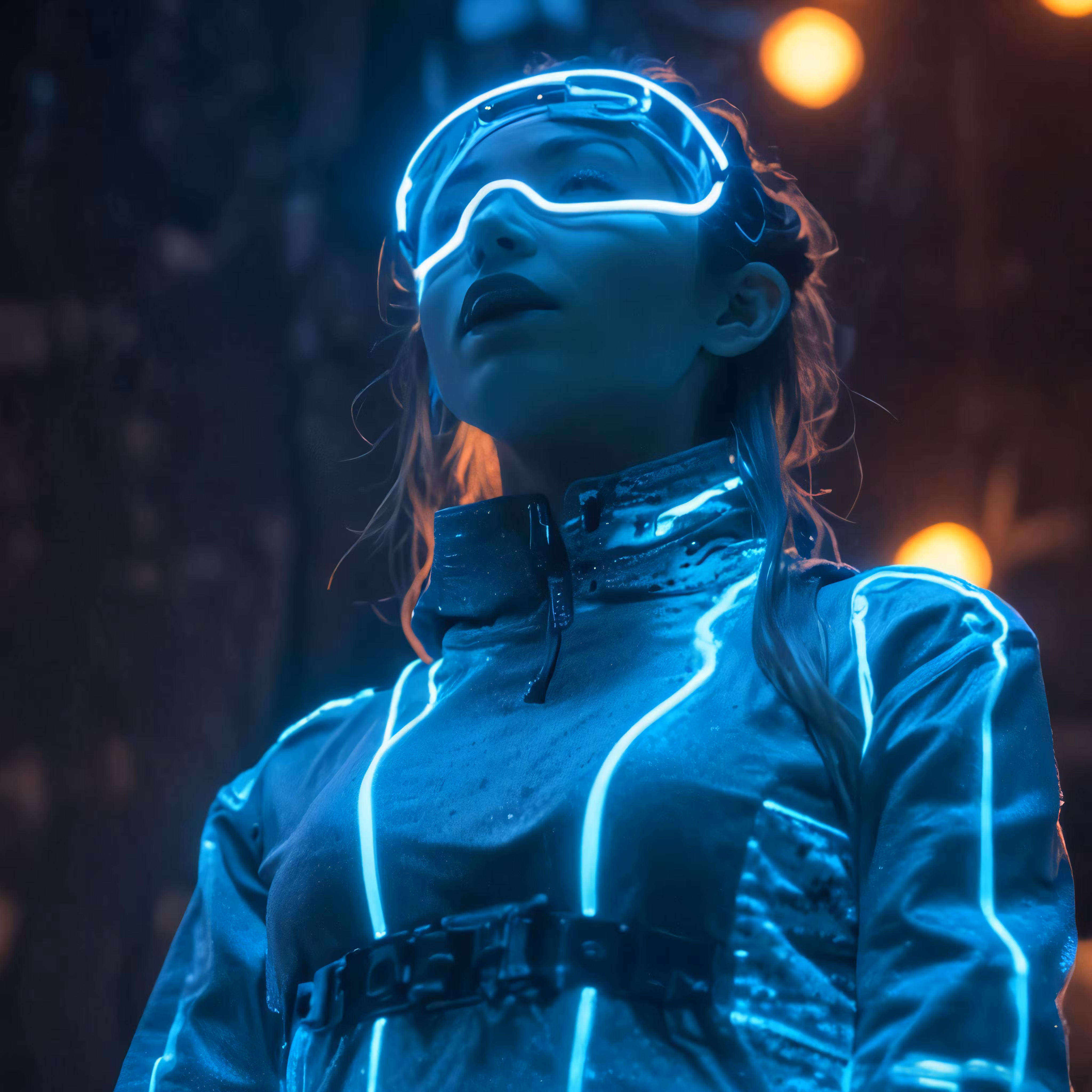 High resolution picture, free to use, a woman dressed up in a glowing outfit
