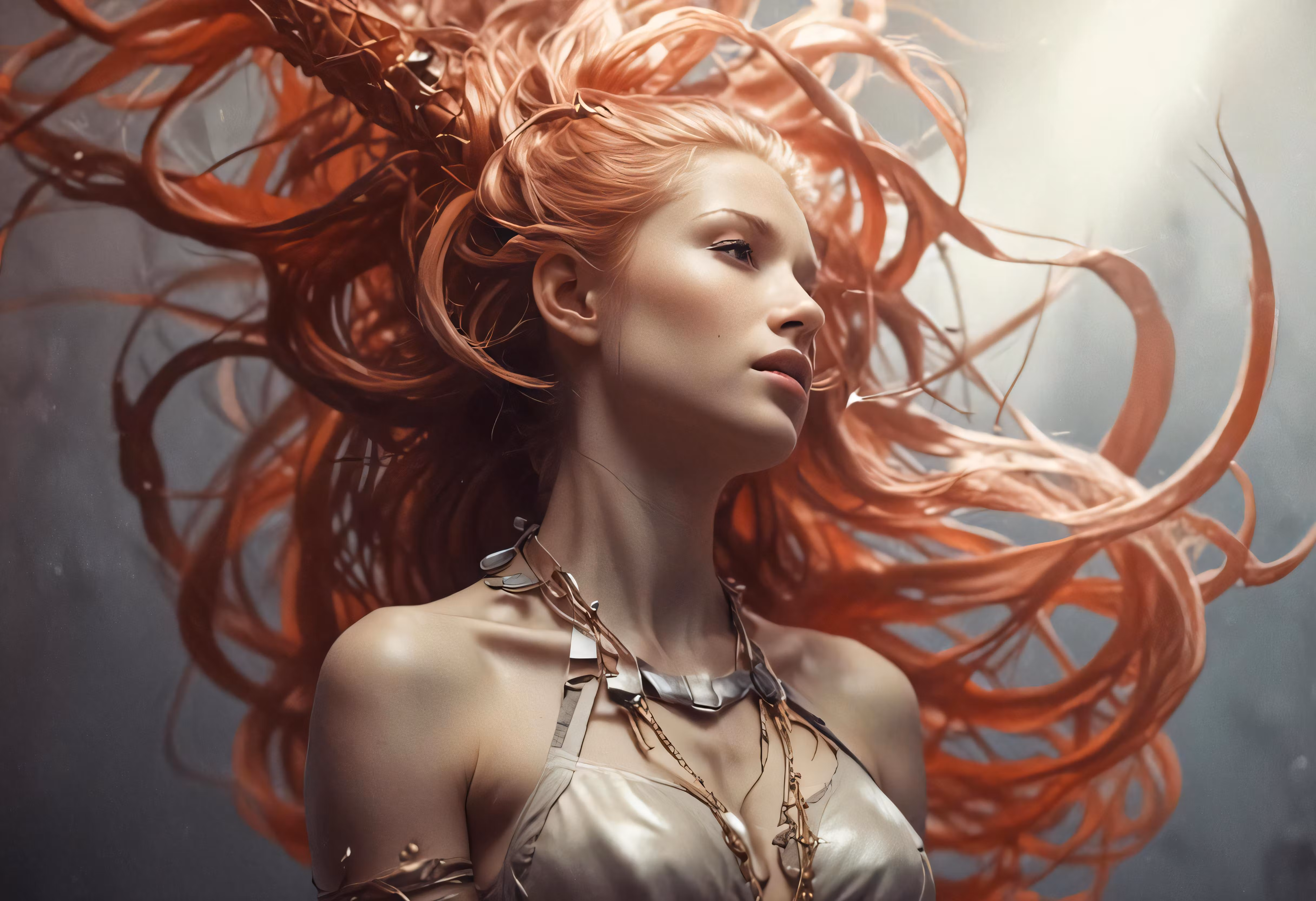 High resolution picture, free to use, a woman has her hair blown up in the wind