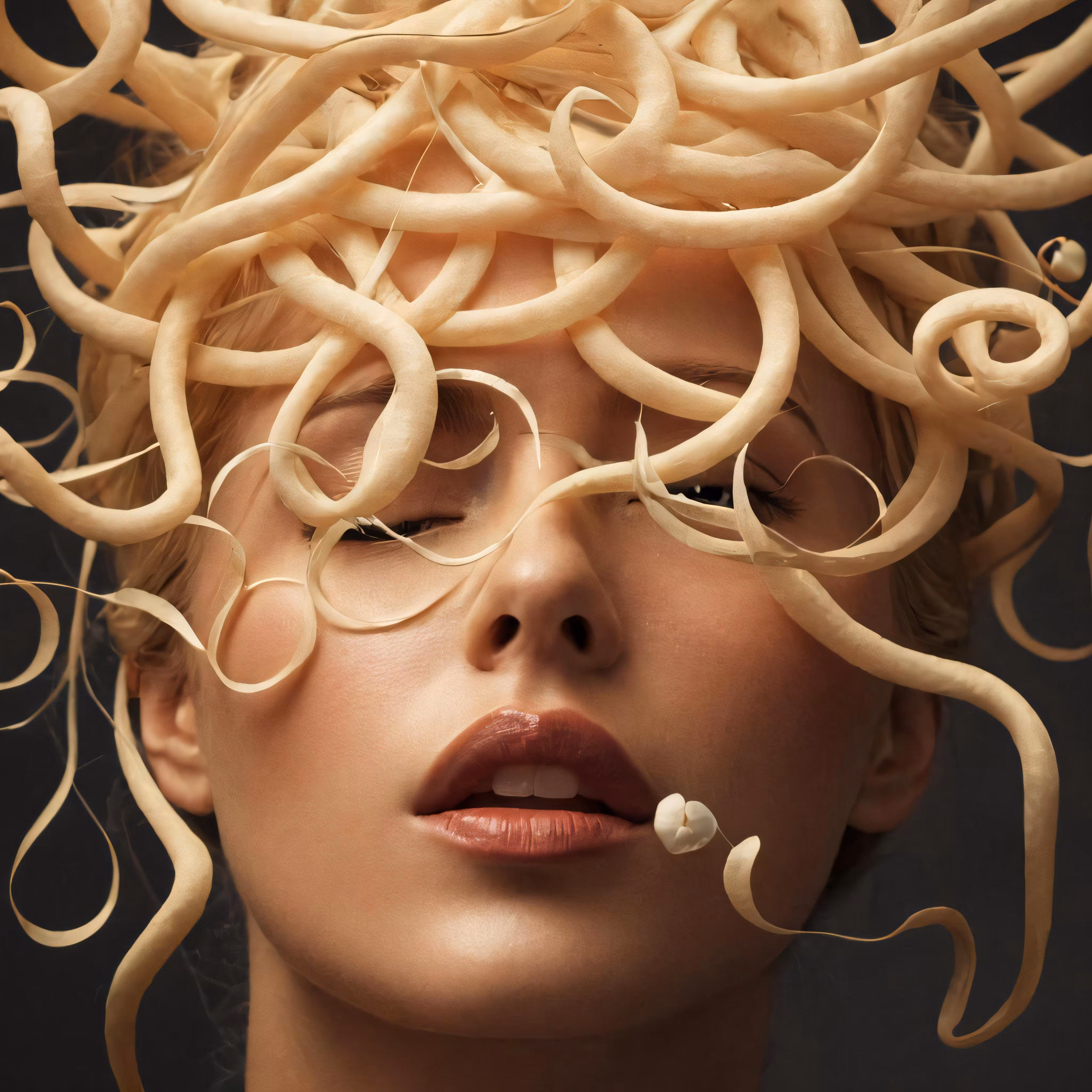 High resolution picture, free to use, a woman has her head made from some noodles