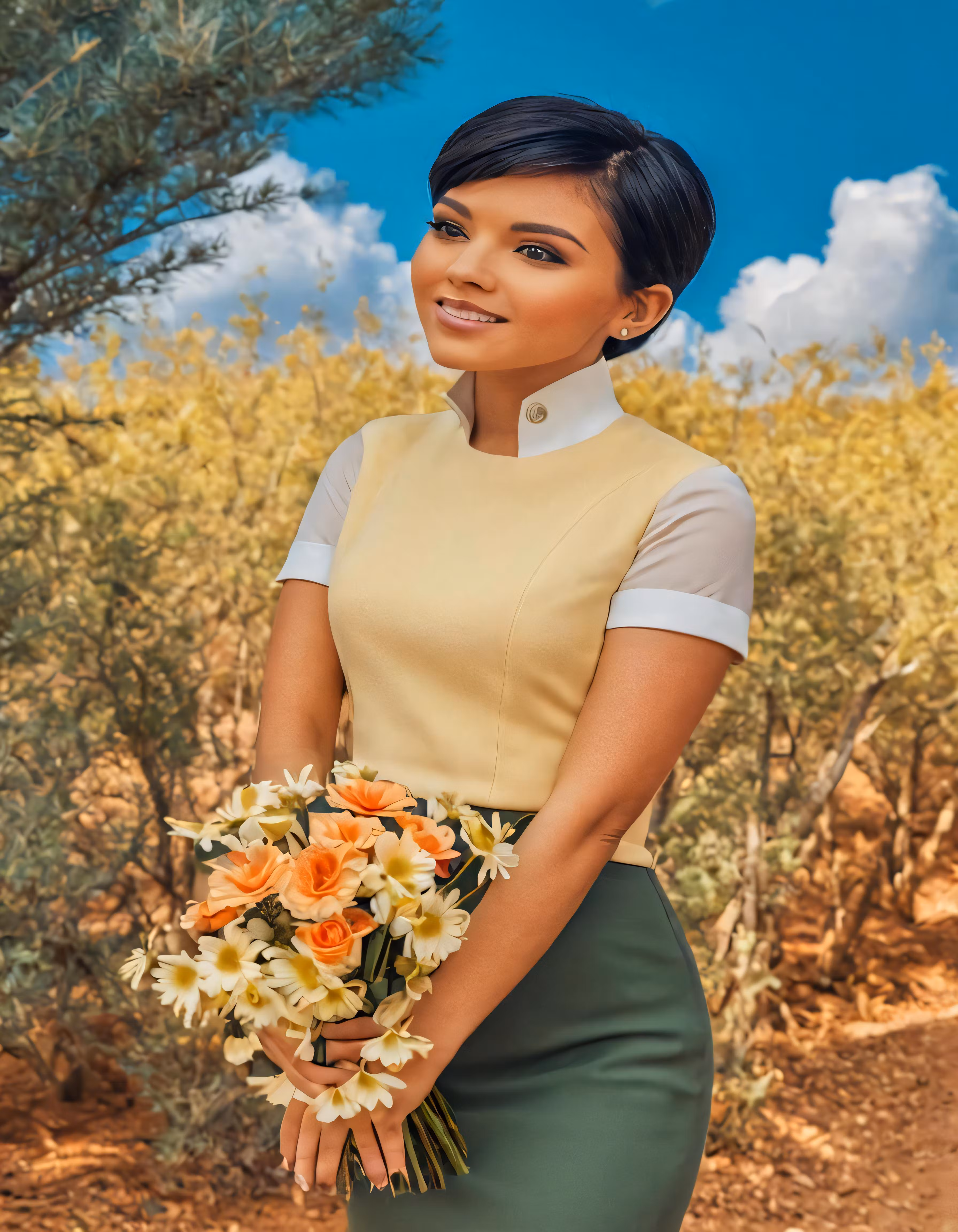 High resolution picture, free to use, a woman holding a bouquet and wearing green dress