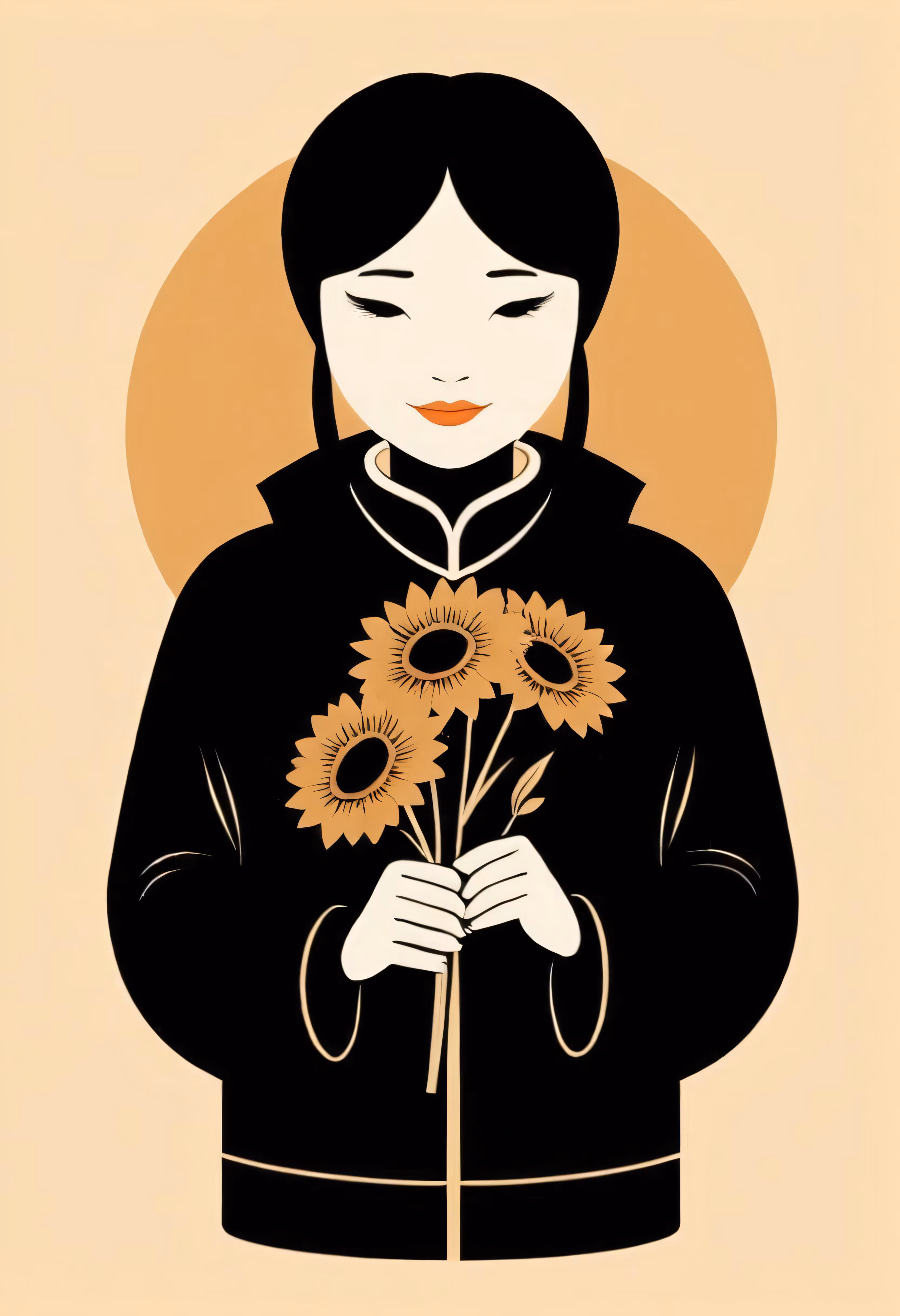 High resolution picture, free to use, a woman holding a bunch of sunflowers while wearing a hoodie