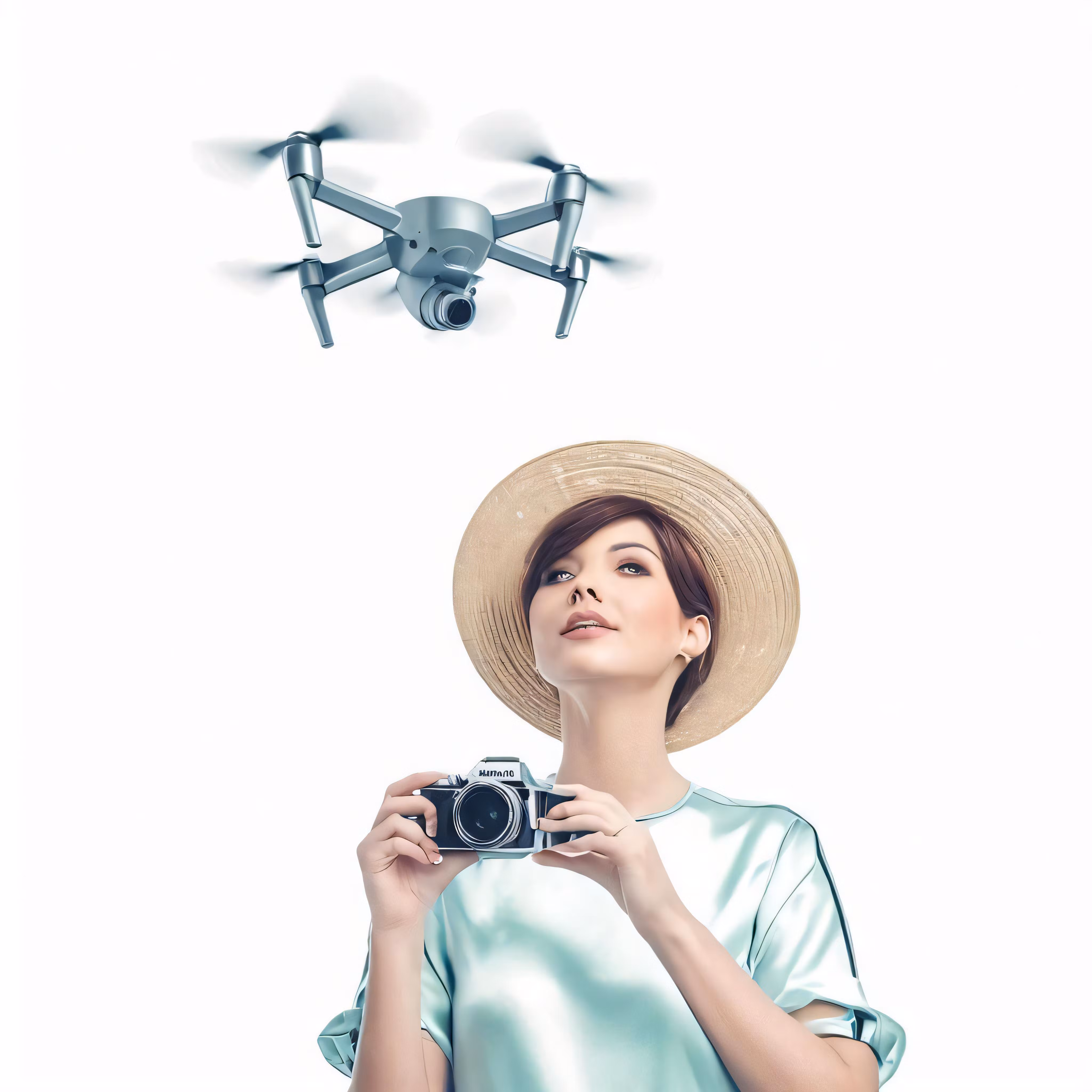 High resolution picture, free to use, a woman holding a camera in front of a flying object
