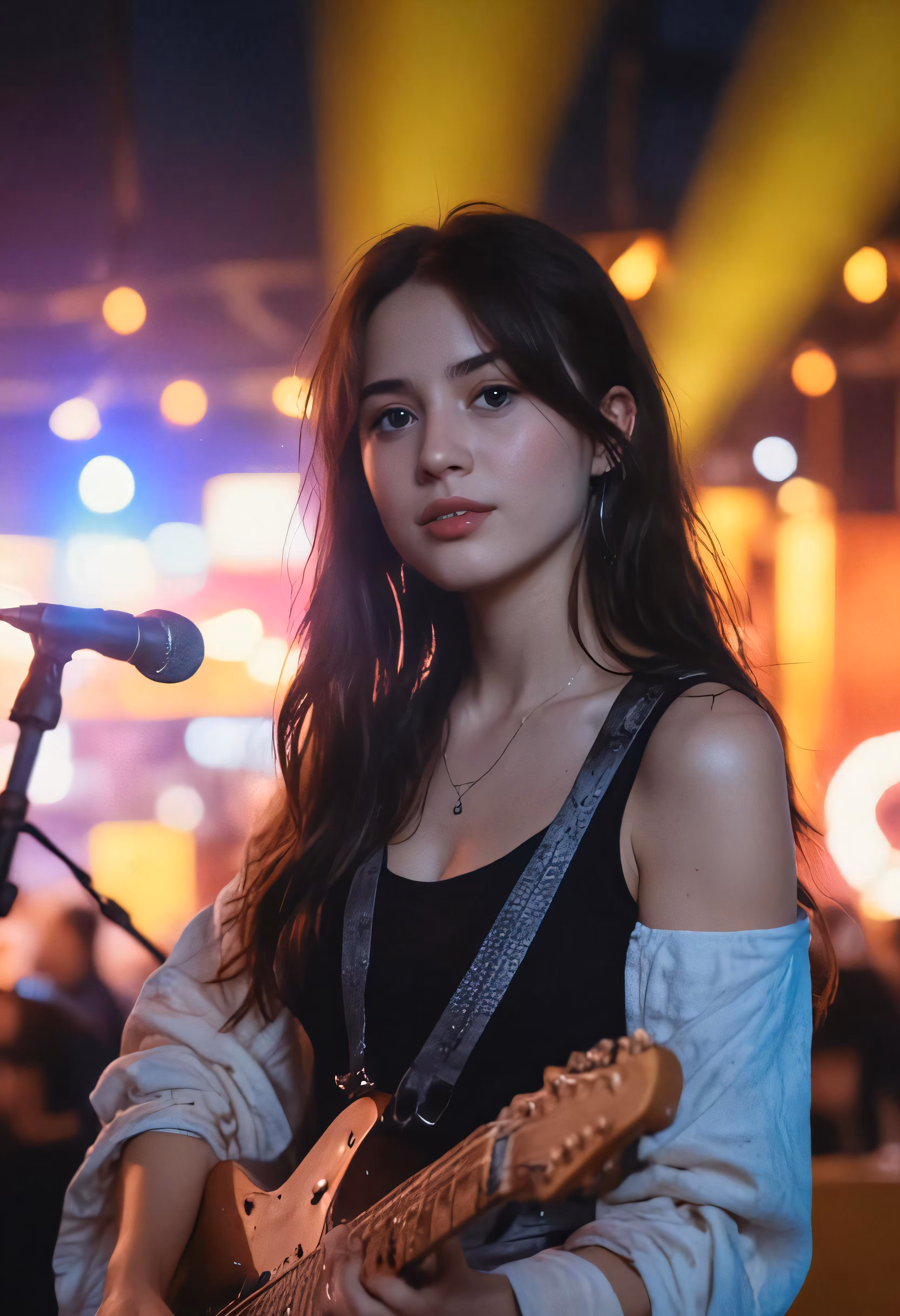 High resolution picture, free to use, a woman holding a guitar in front of a microphone