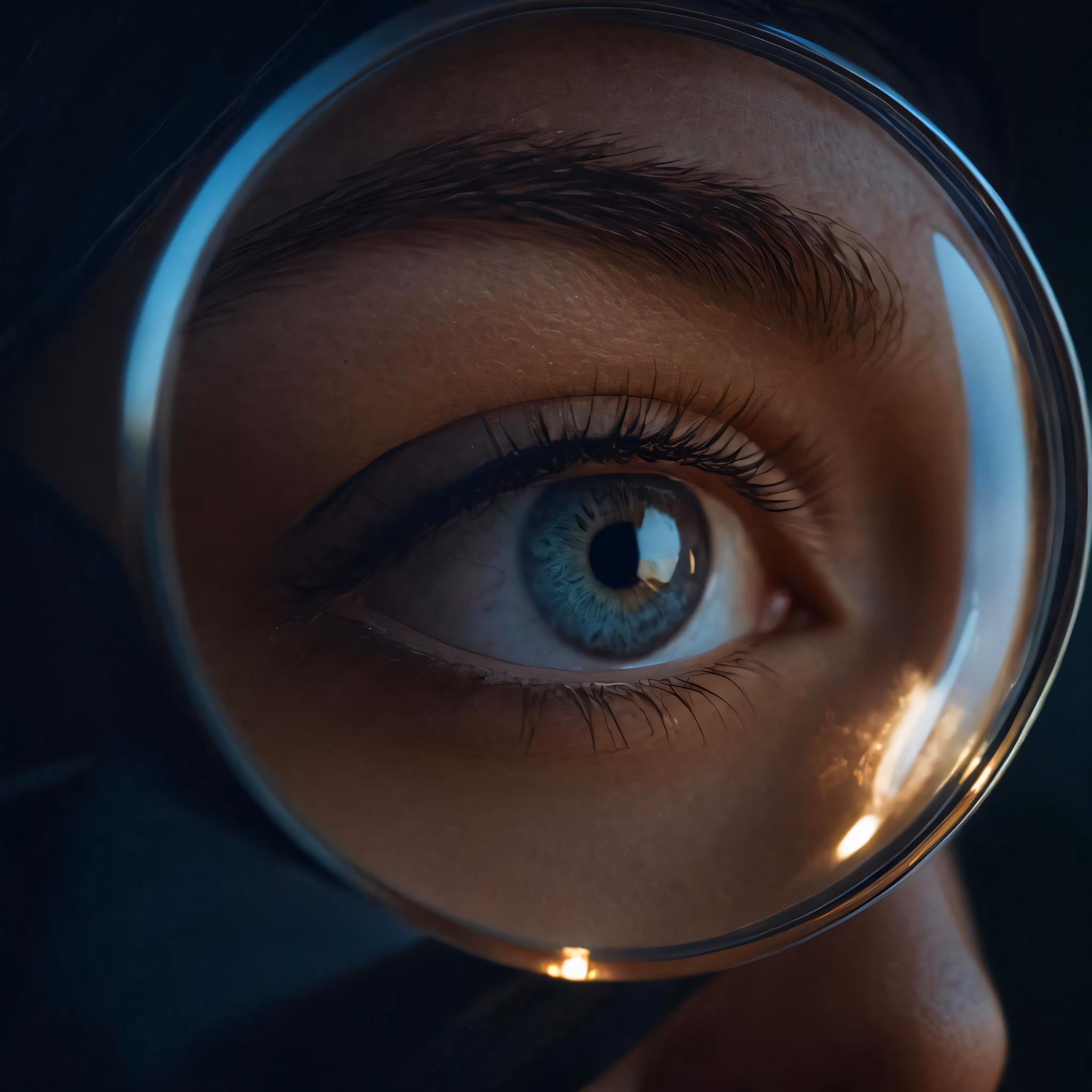 High resolution picture, free to use, a woman holding a magnifying glass over her eye