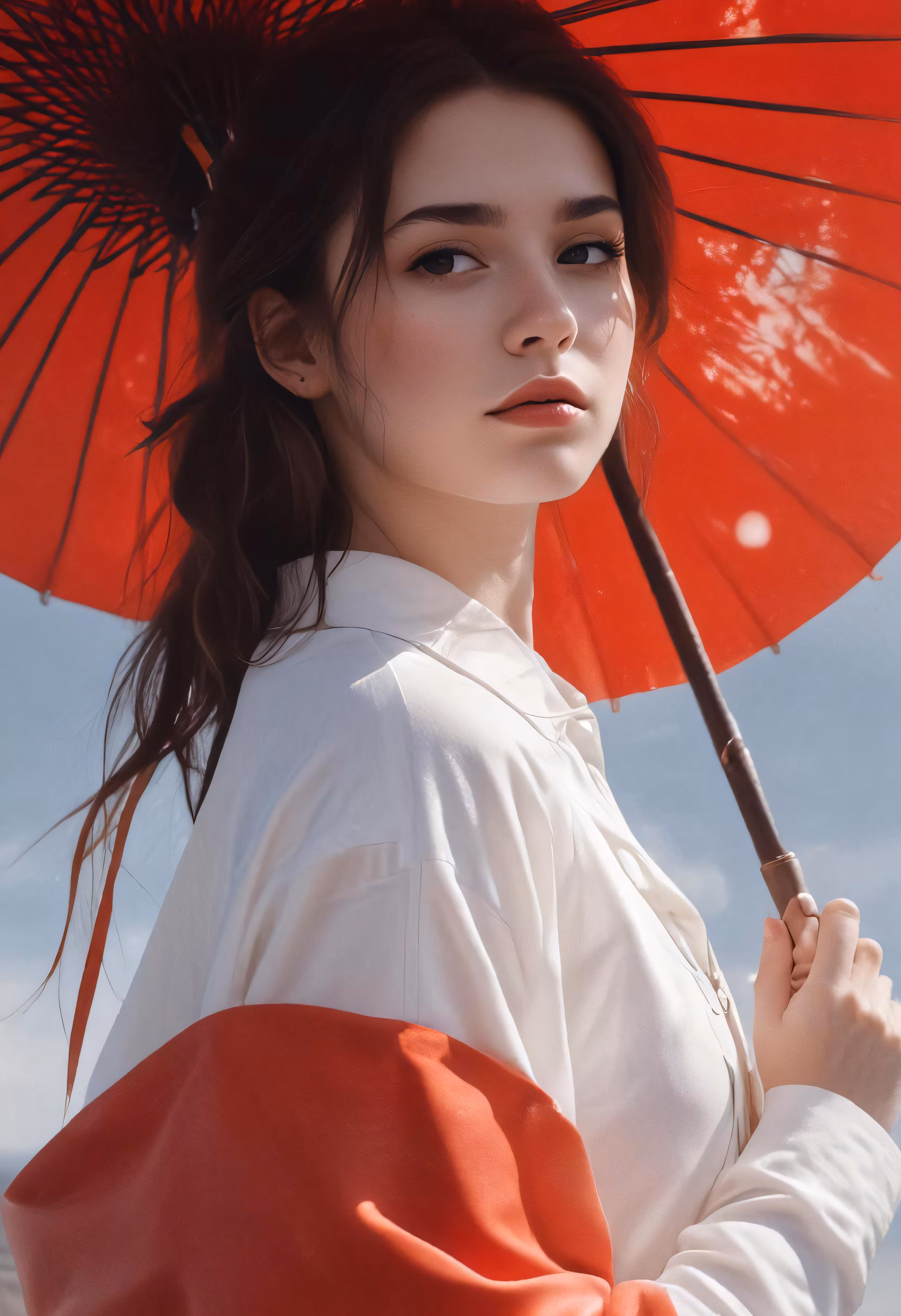 High resolution picture, free to use, a woman holding an orange umbrella over her head