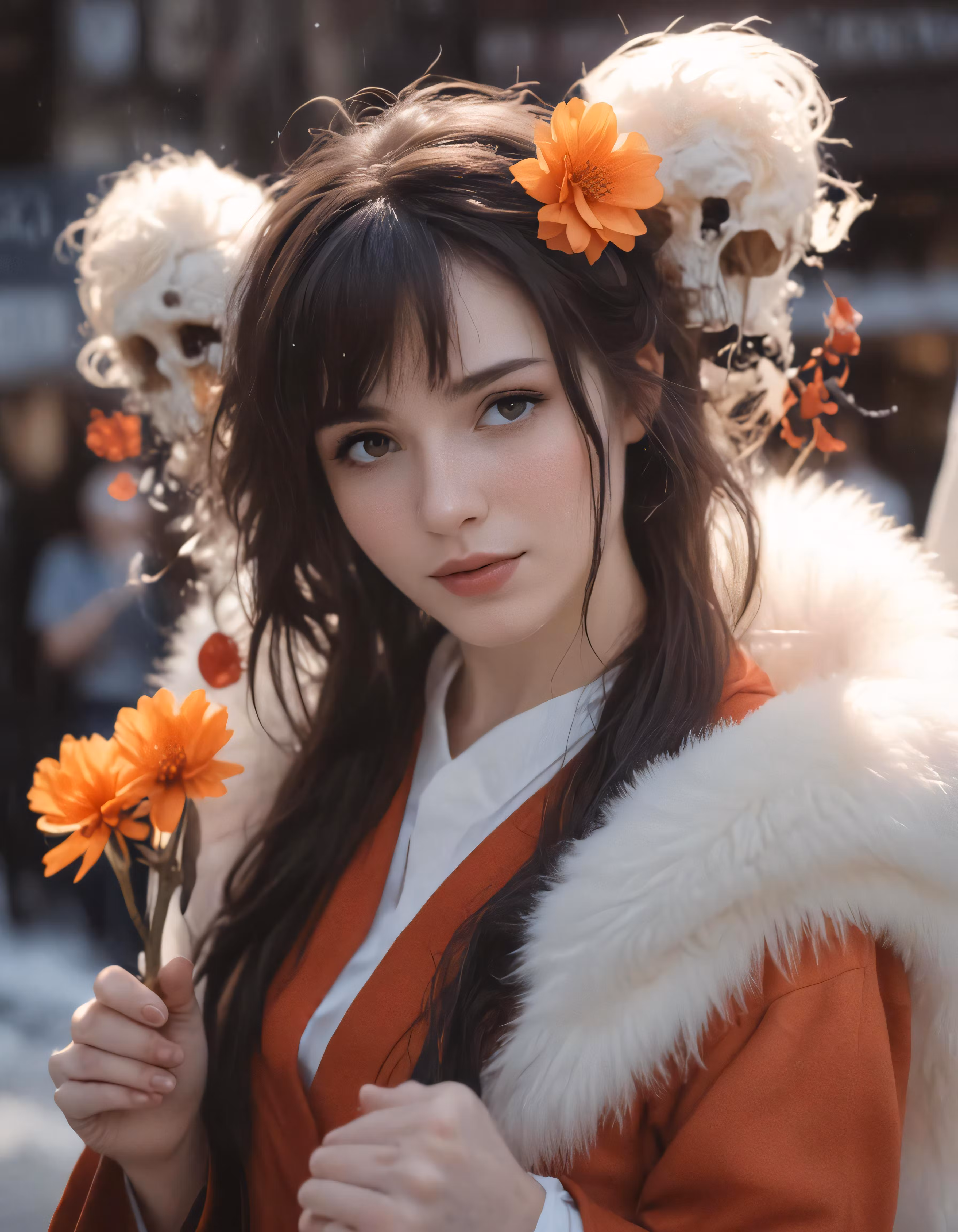 High resolution picture, free to use, a woman holding flowers with three skulls on her head