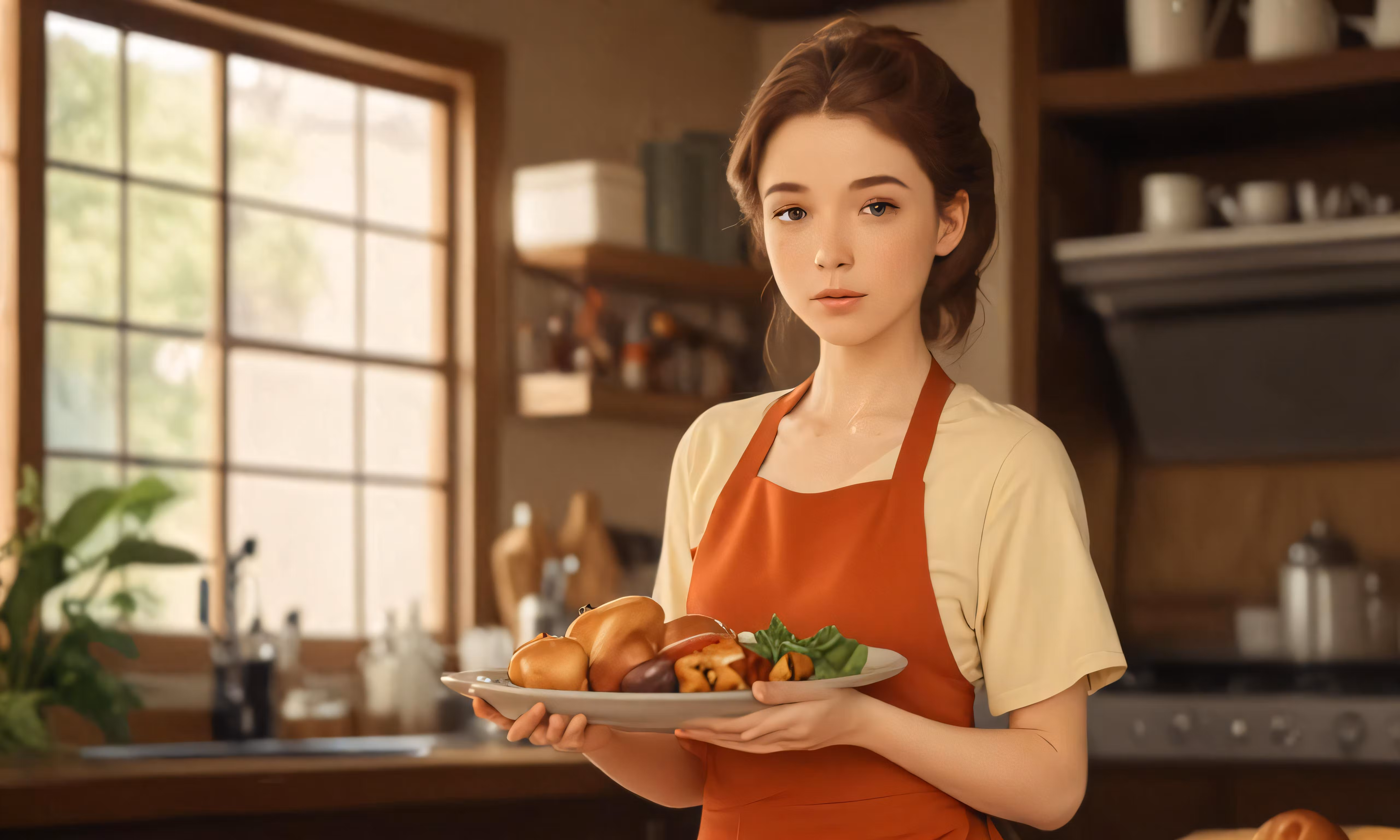 High resolution picture, free to use, a woman holding food standing in a kitchen