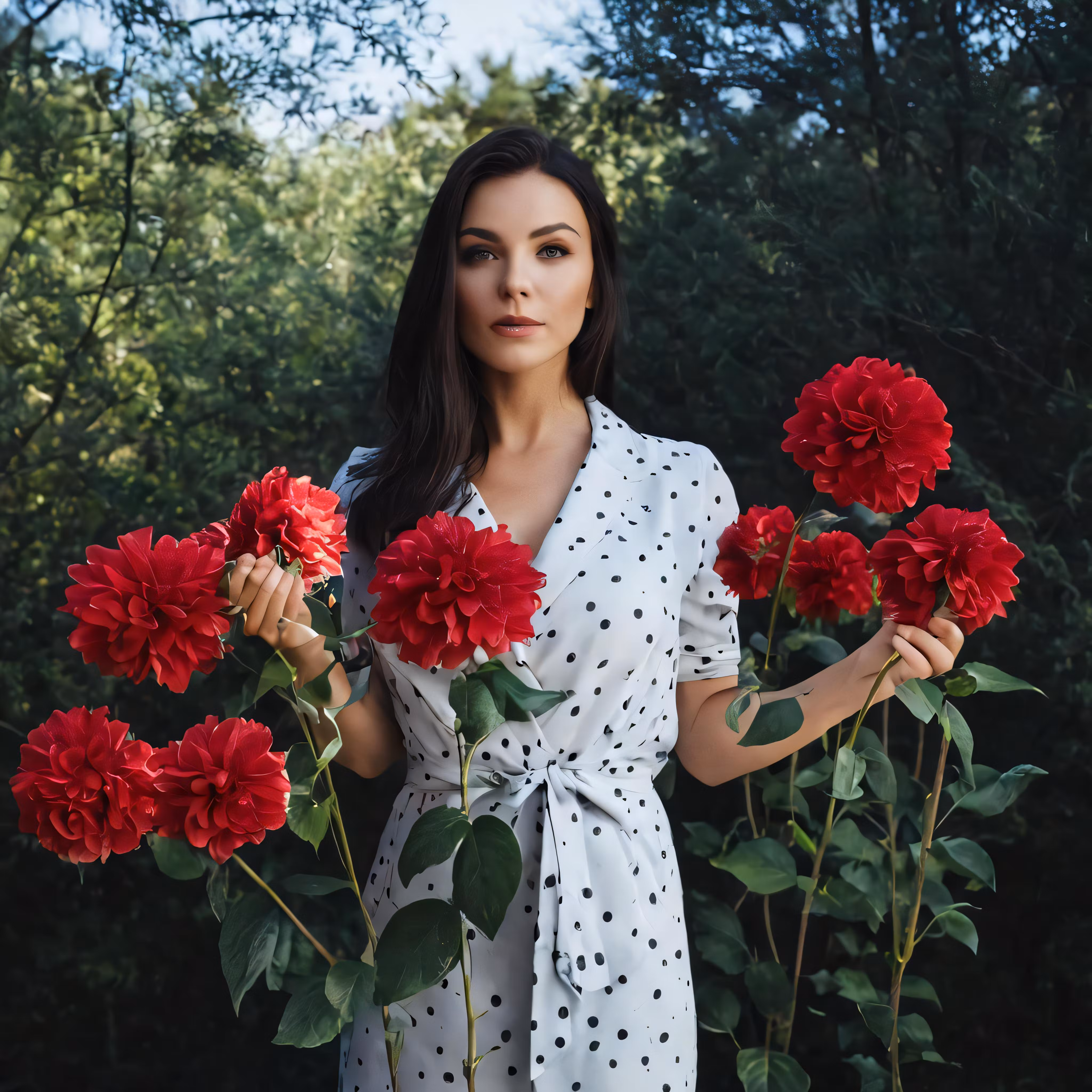 High resolution picture, free to use, a woman holds out some flowers in front of her face