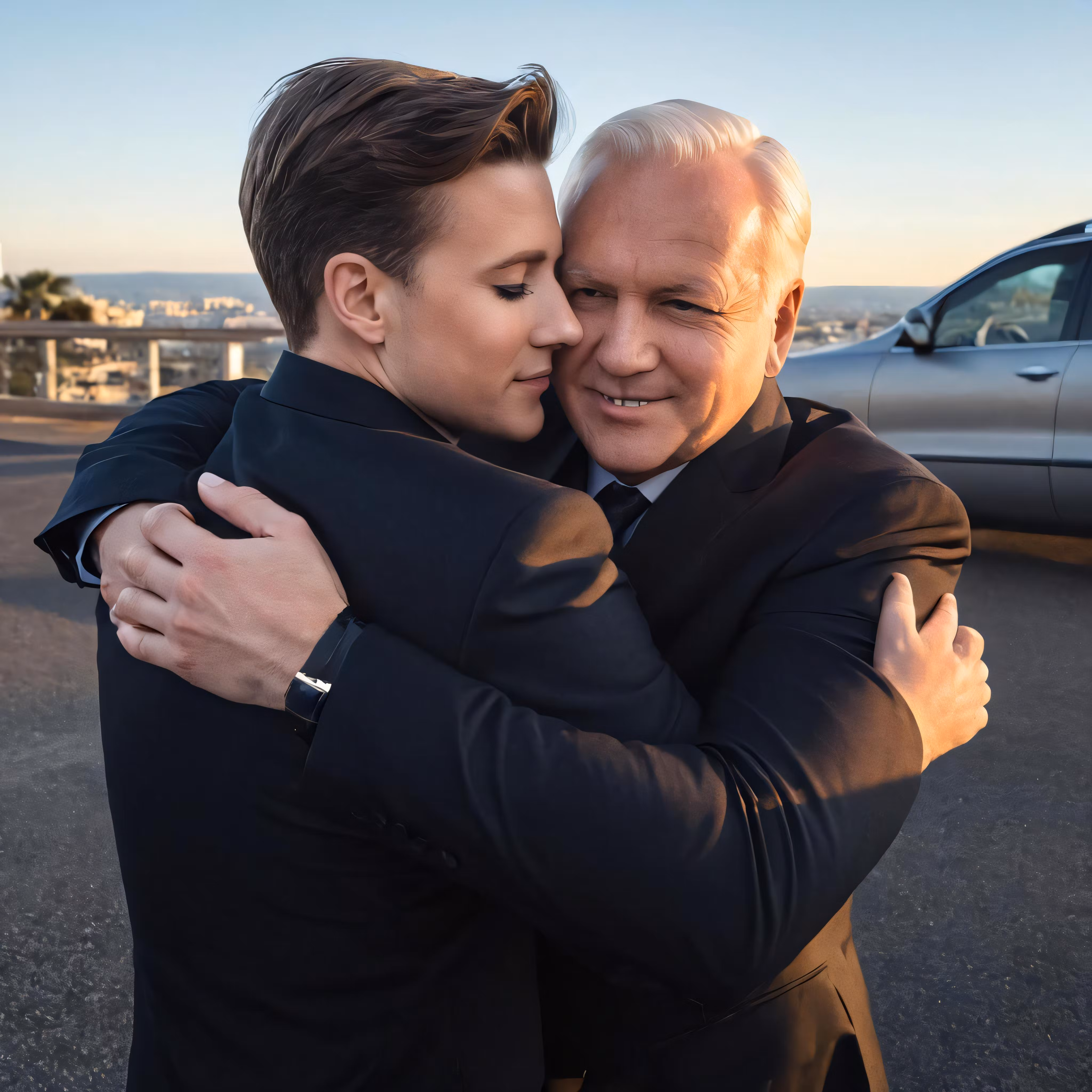 High resolution picture, free to use, a woman hugs the head of a man in a suit