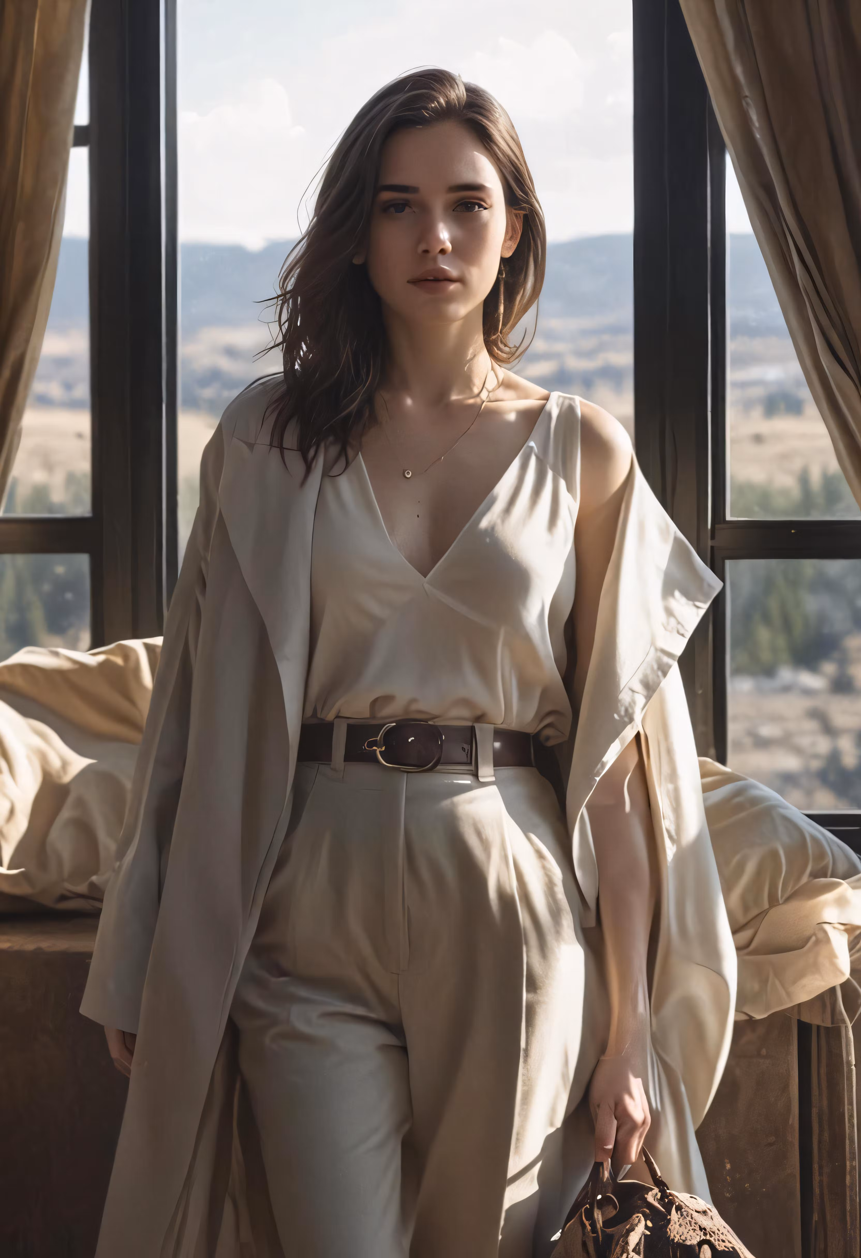 High resolution picture, free to use, a woman in a beige outfit is walking past a window