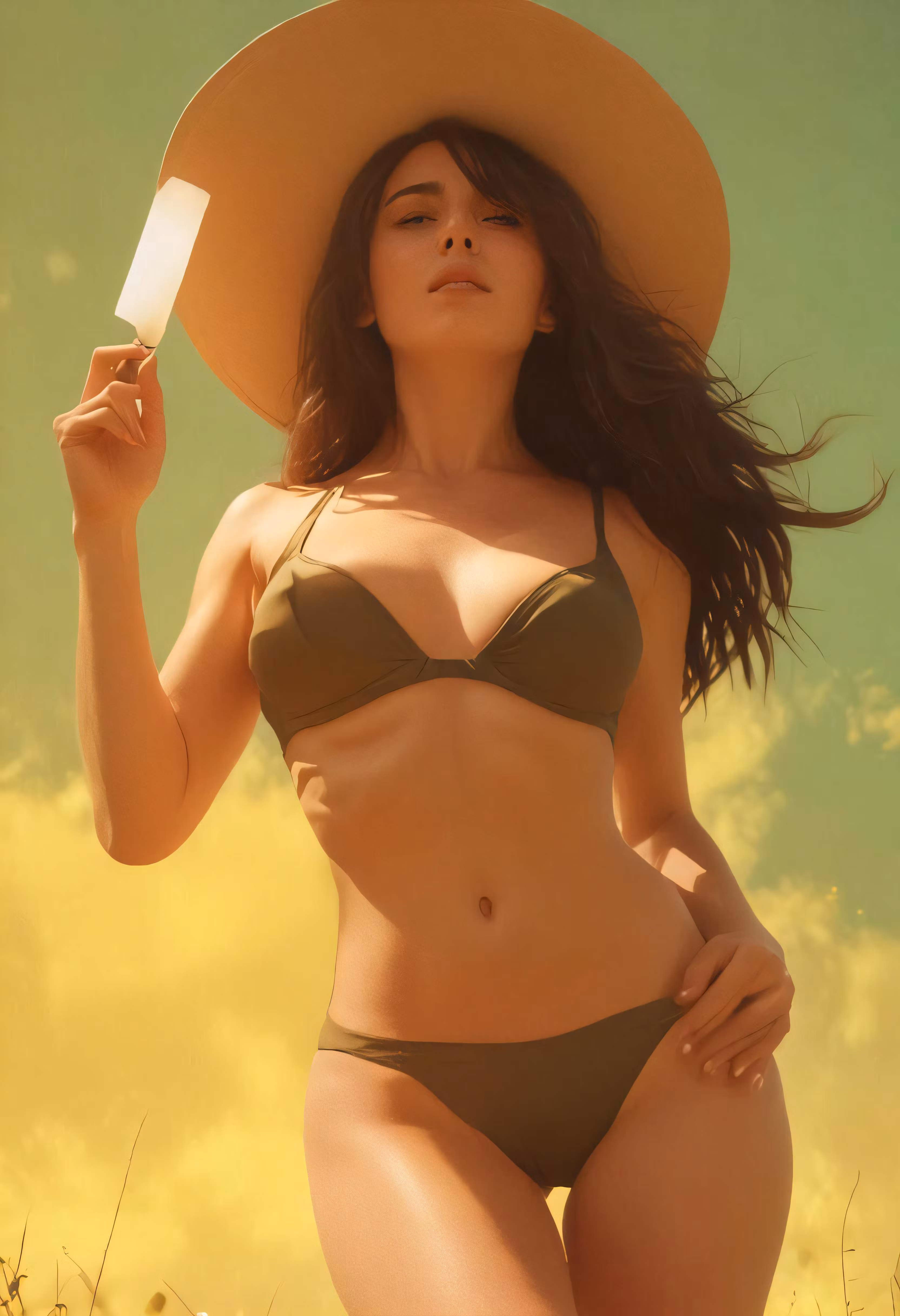 High resolution picture, free to use, a woman in a bikini and hat holding an object